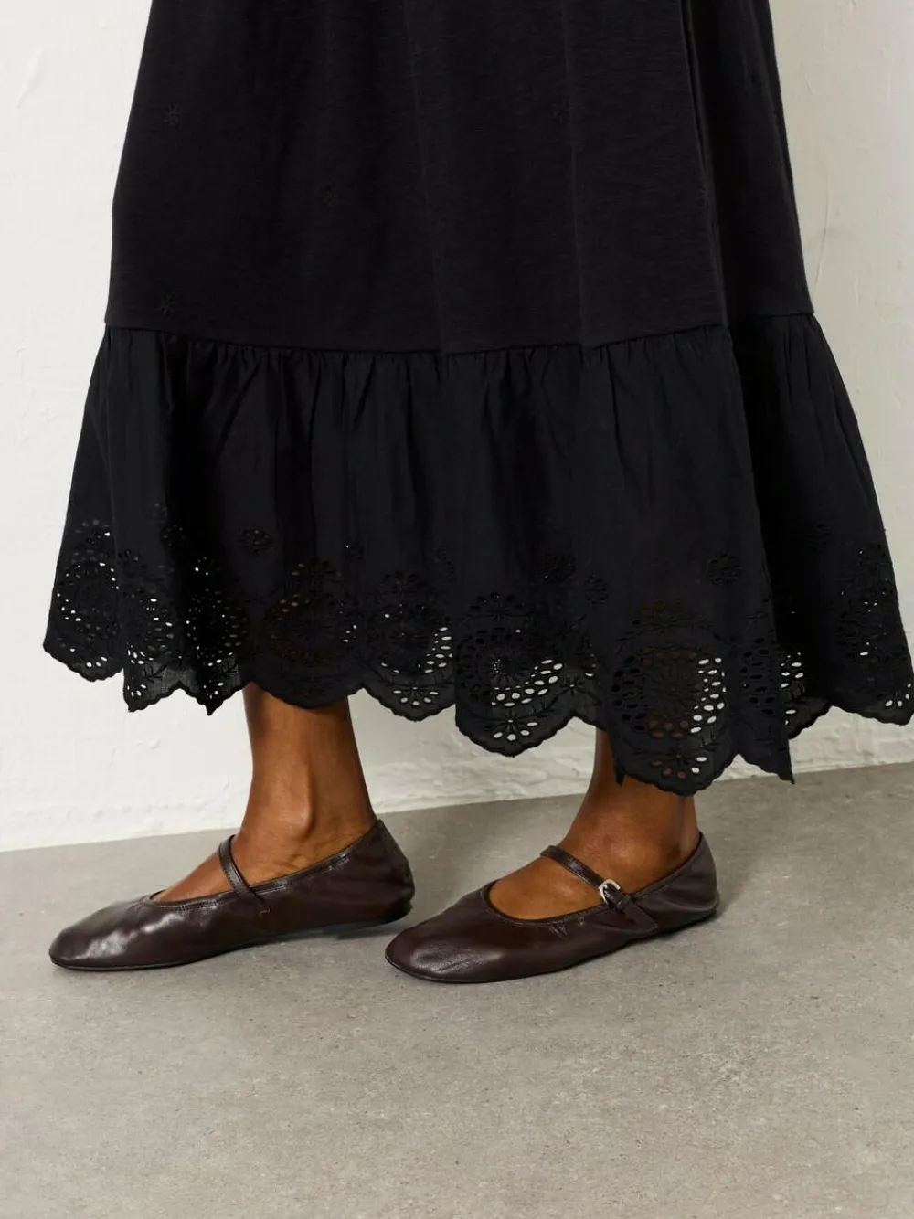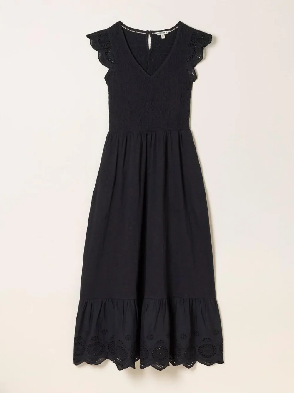 The Demi jersey midi dress features scalloped short sleeves with subtle cut-outs and a matching cut-out hem for a beautifully finished look. Made from soft jersey with a flattering fit, it’s perfect for sunny days, weekend plans, or dressing up with sandals for an easy evening outfit. Petite side neck to hem 51″ / 130cm. Machine washable. Main 100% Cotton. Panel 100% Cotton. Embroidery 100% Recycled polyester.