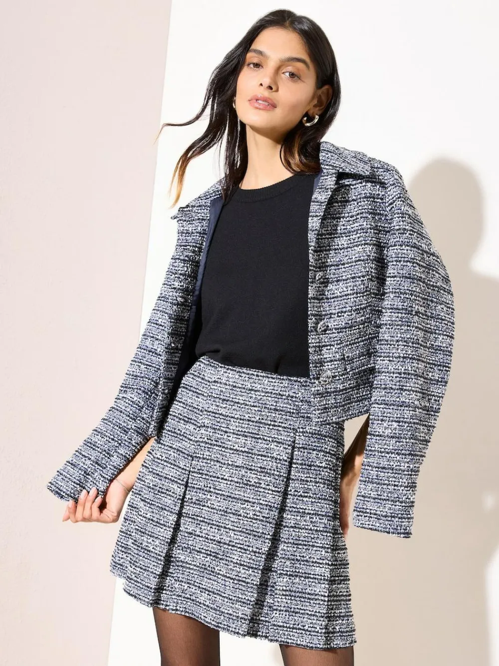 Our Boucle Pleated Mini Skirt is a chic and playful addition to your wardrobe. Designed in a textured boucle stretch fabric in a goregous blue, this mini features a pleated shape that adds movement to every step. Pair with our matching trophy jacket. Perfect for pairing with tights and boots or dressing up with heels for a more smart look. Model wears a size UK 8. 85% Polyester, 7% Cotton, 6% Acrylic, 1% Elastane, 1% Metallised fibre.