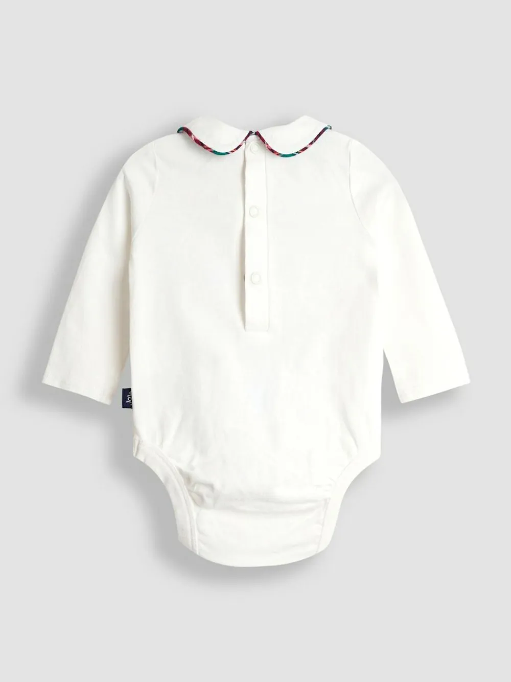 Traditional tartan is always a good choice! This sweet set features dungarees with navy, red, green, and yellow checks on repeat and a plain white body that s made to match, complete with check piping along the collar. Ideal for Christmas parties or smarter occasions, you’ll want to stock up on tartan dungarees in lots of sizes so your children can grow into their clothes. White bodysuit with poppers for easy changes Peter Pan collar with check piping Tartan dungarees Buttoned shoulder straps Machine washable Top 100% Cotton. Woven 97% Polyester, 3% Elastane. Collar 100% Cotton.