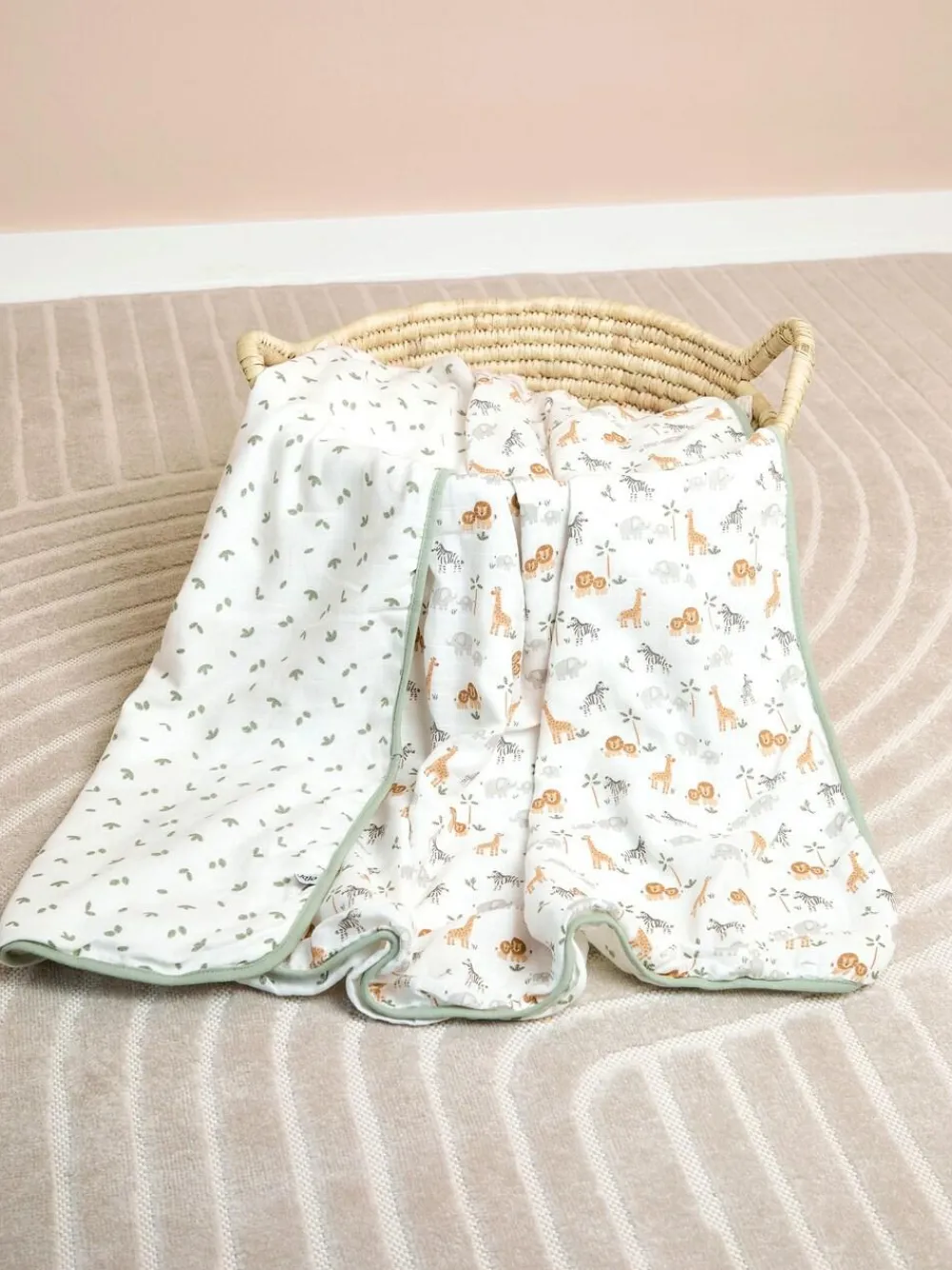 Bundle them up in a super soft muslin with this sweet floral blanket. Made to be gentle on babies’ sensitive skin, this snuggly muslin blanket is also absorbent and large enough in size to be used as a pram cover, or as a breastfeeding cover, as well as wiping up spills and placed over the shoulder for burping. Safari print muslin blanket Multi-use Highly absorbent Ideal gift 120 x 100cm Suitable from birth Machine washable Please note: If using as a swaddle, avoid binding your baby’s hip to ensure a hip-healthy position