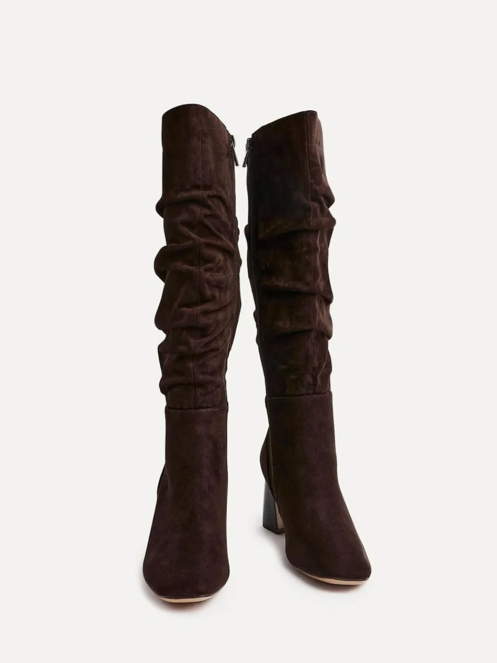 Our Alpine high leg boots are the perfect finishing touch to any outfit. Featuring a square toe, ruched detailing, and a convenient half zip, they’re effortlessly stylish and easy to wear. Set on a stacked block heel with a cushioned insole and faux fur lining, keeping you warm and comfortable. Boot Length: 36.5cm Heel height 6.5cm. Upper – 100% Other fibres, Lining. and Sock – 100% Other fibres. Sole – 100% Rubber.