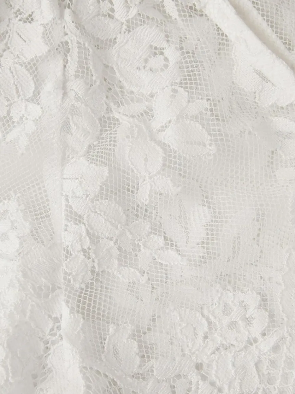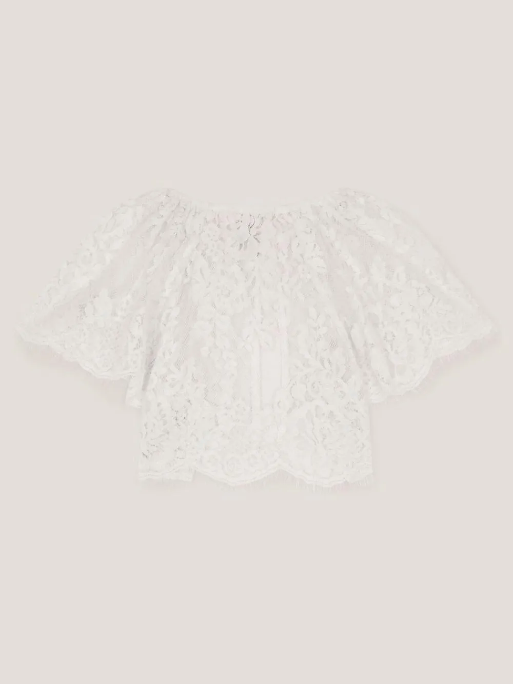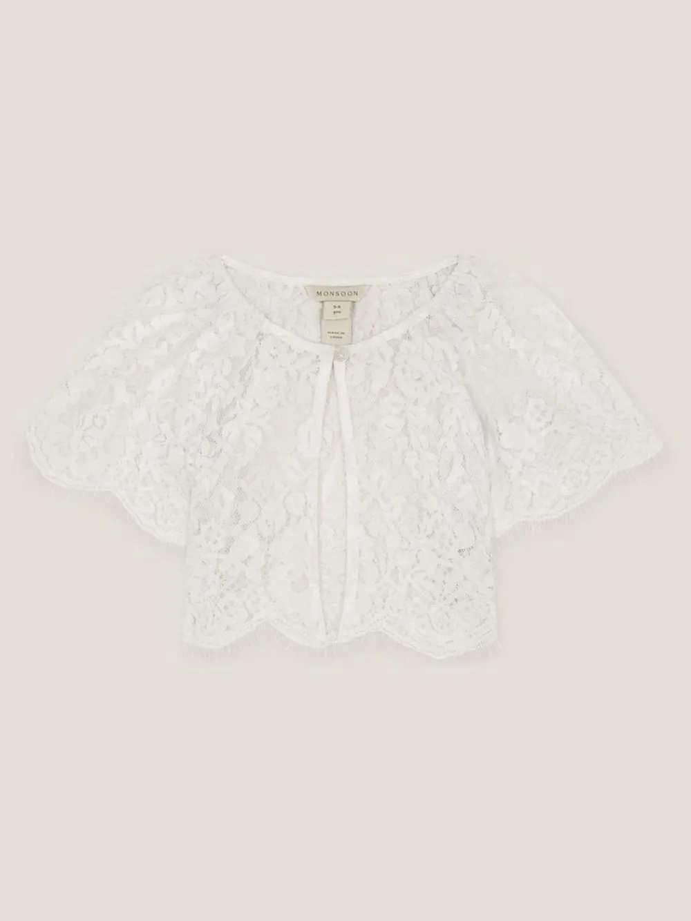 Cute as a button. Designed in ivory lace with short sleeves and fringe scalloped hems, this cover-up is a beautiful pick to layer over all their strappy party dresses. Finished with a single button fastening at the neckline………….. Machine washable. Main 80% Nylon, 20% Cotton. Trim 100% Polyester.