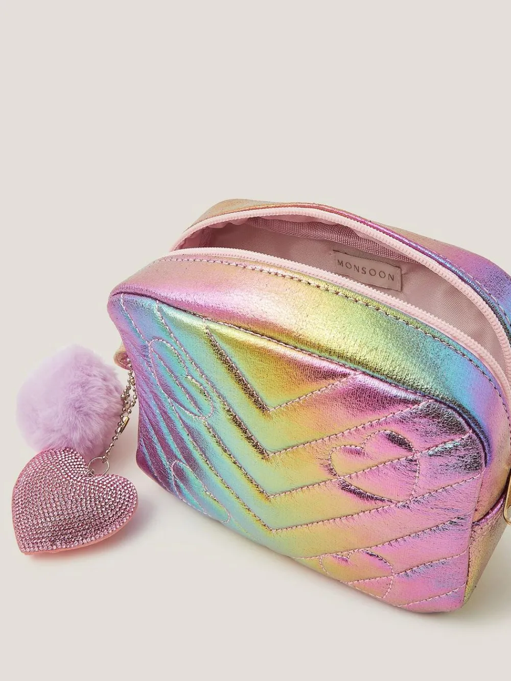 Bring the magic. Quilted with hearts and chevron stripes, this bag features a rainbow metallic design with diamanté heart and faux pom-pom charms. Whether they re going on a playdate or staycation, it fit all the bits they can t live without. Finished with a zip fastening and cross body strap. Height 13cm Width 5cm Depth 13cm 80% Polyurethane, 15% Polyester, 5% Iron.