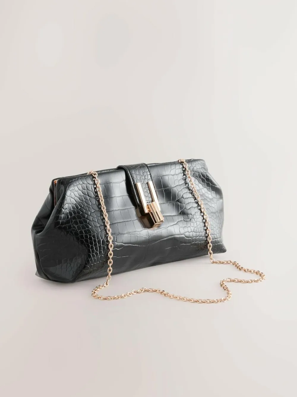 Complete your evening look with this black croc-effect clutch bag. The PU material and stylish croc print offer a luxurious texture and a modern feel, while the sleek shape makes it the perfect accessory for a night out or a special occasion. For versatile wear, it comes with an optional gold-toned chain strapCroc-effect print PU material Optional chain strap Snap closure Structured clutch bag Height 13cm Width 25cm Depth 7cm Outer 100% PU. Lining 100% Recycled polyester.