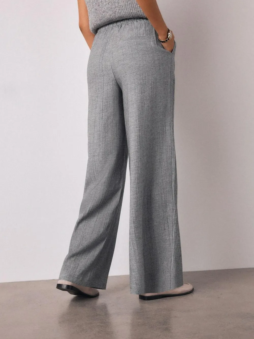 Upgrade your seasonal wardrobe with these elegant grey wide leg trousers. Expertly crafted from a soft blend containing wool, they offer sophisticated warmth and a fluid silhouette. The elasticated tie waist provides a personalised fit for all-day comfort, while side pockets add a practical touch to this refined essential. Wide leg style Elasticated tie waist Side pockets Contains wool Short to fit inside leg 27″ / 69cm. Regular to fit inside leg 29″ / 74cm. Long to fit inside leg 31″ / 79cm. XL Tall to fit inside leg 33″ / 84cm. Machine washable. 48% LENZING™ ECOVERO™ Viscose, 47% Recycled polyester, 5% Wool. Items with the curve logo are available in sizes 18 and above., Our tall collection is designed to fit women 5’10” and above. This has been proportionally increased through the body, leg and sleeve to achieve the perfect fit. Available in sizes 8-20.