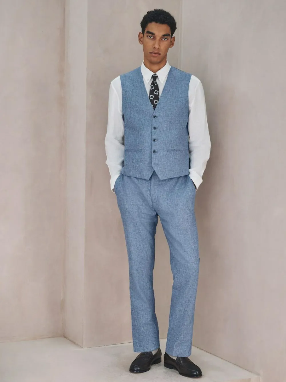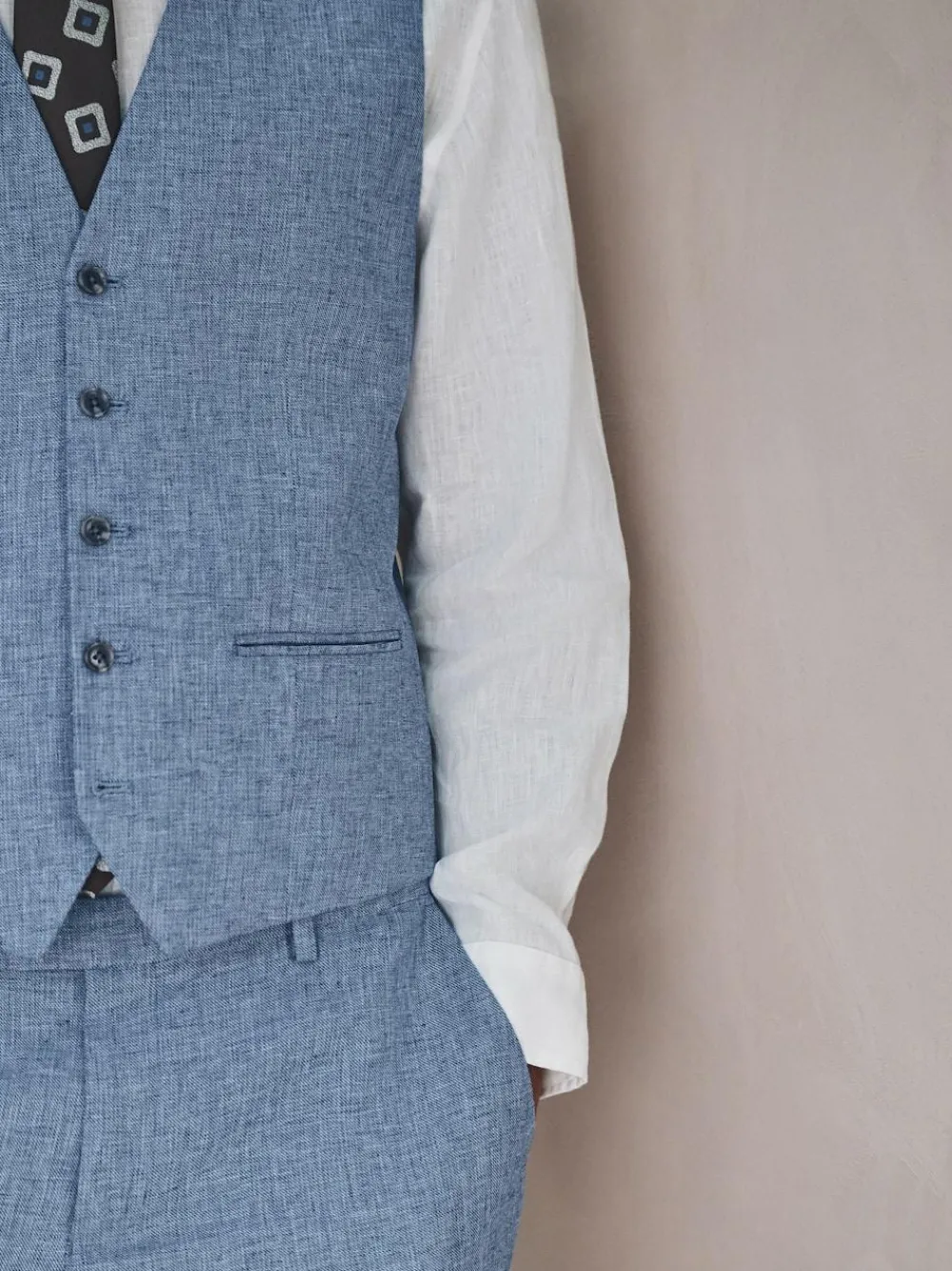Complete your sharp, refined attire with this blue Linen Blend Texture Suit Waistcoat. Designed for formal or special occasions, its textured finish and classic button front offer a sophisticated, breathable layer perfect for warm-weather dressing. Blue Linen blend Textured fabric Button fastening Sleeveless Main 55% Linen, 45% Cotton. Inner Lining 100% Recycled polyester. Outer Lining 65% Polyester, 35% Cotton.