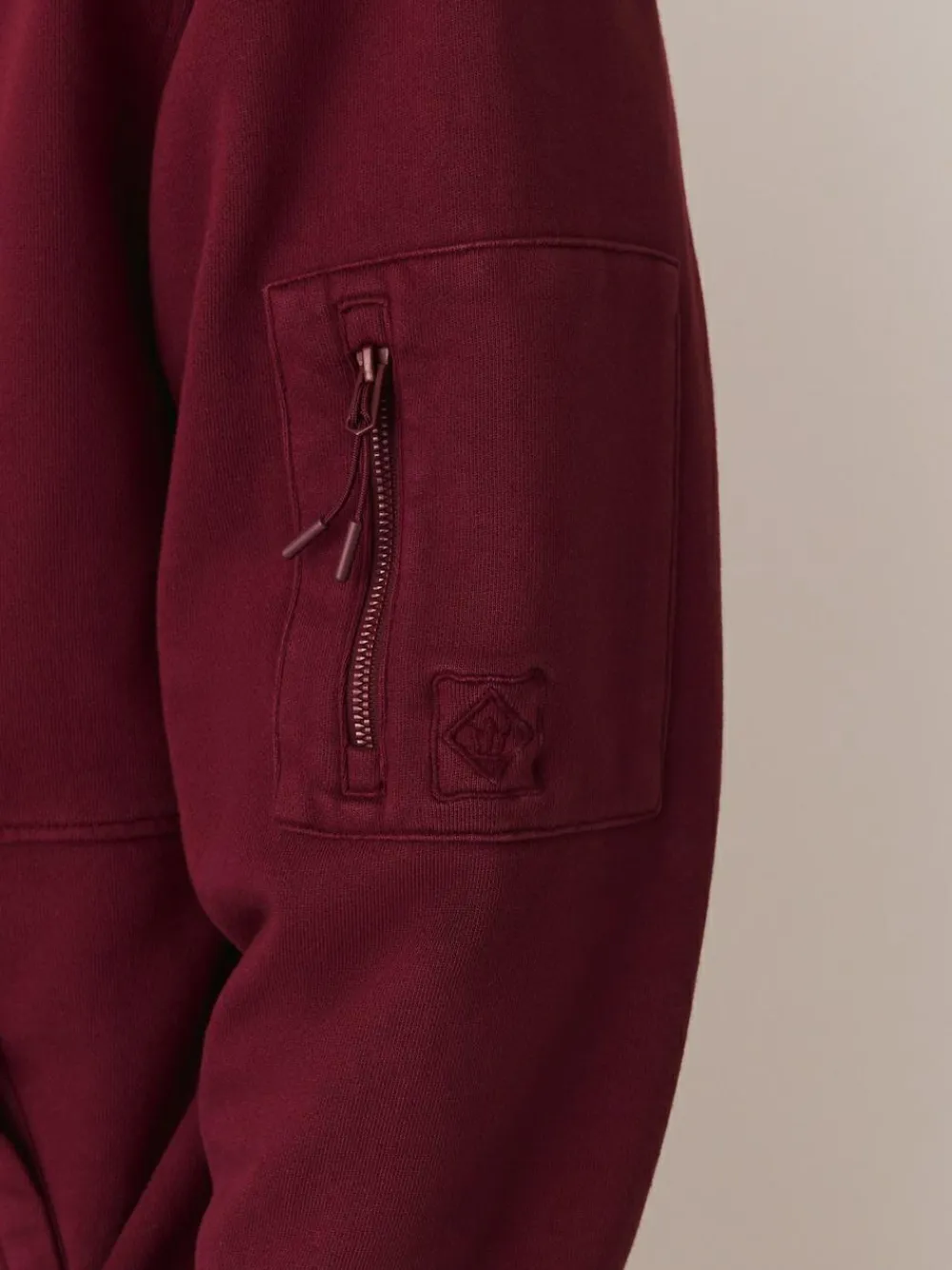 Unwind in this comfortable utility hoodie. Coming in berry red, it’s crafted from a soft handle loopback fabric, and its garment-washed finish gives it a relaxed, worn-in feel. Functional utility-style details, including a sleeve zip pocket and zipped kangaroo pocket, make it a practical and stylish choice for casual layering. Soft handle loopback fabric Garment washed Utility style features Hooded Zip pocket on sleeve Zipped kangaroo pocket Machine washable. 100% Cotton.
