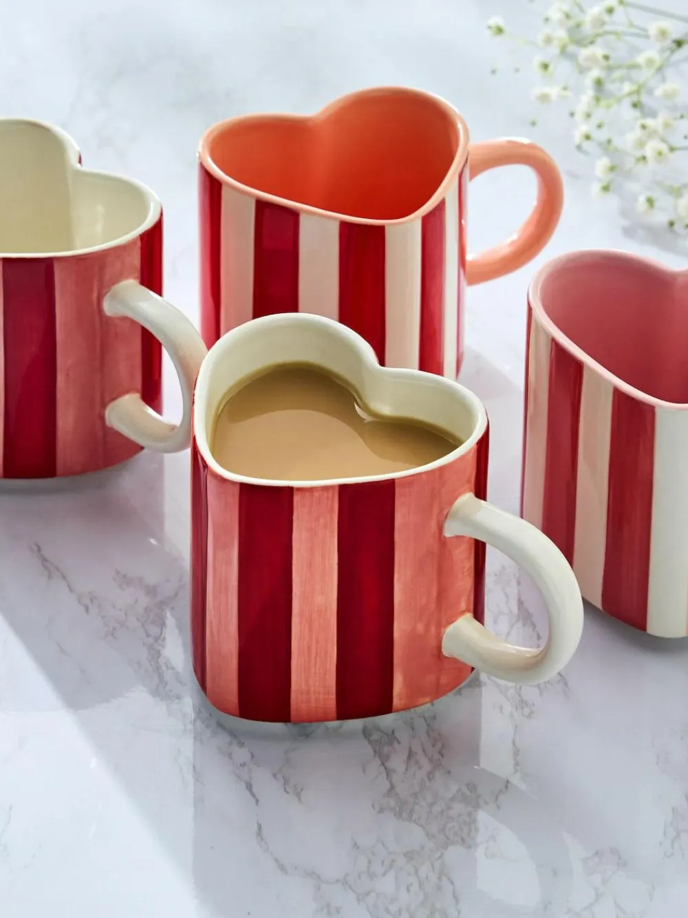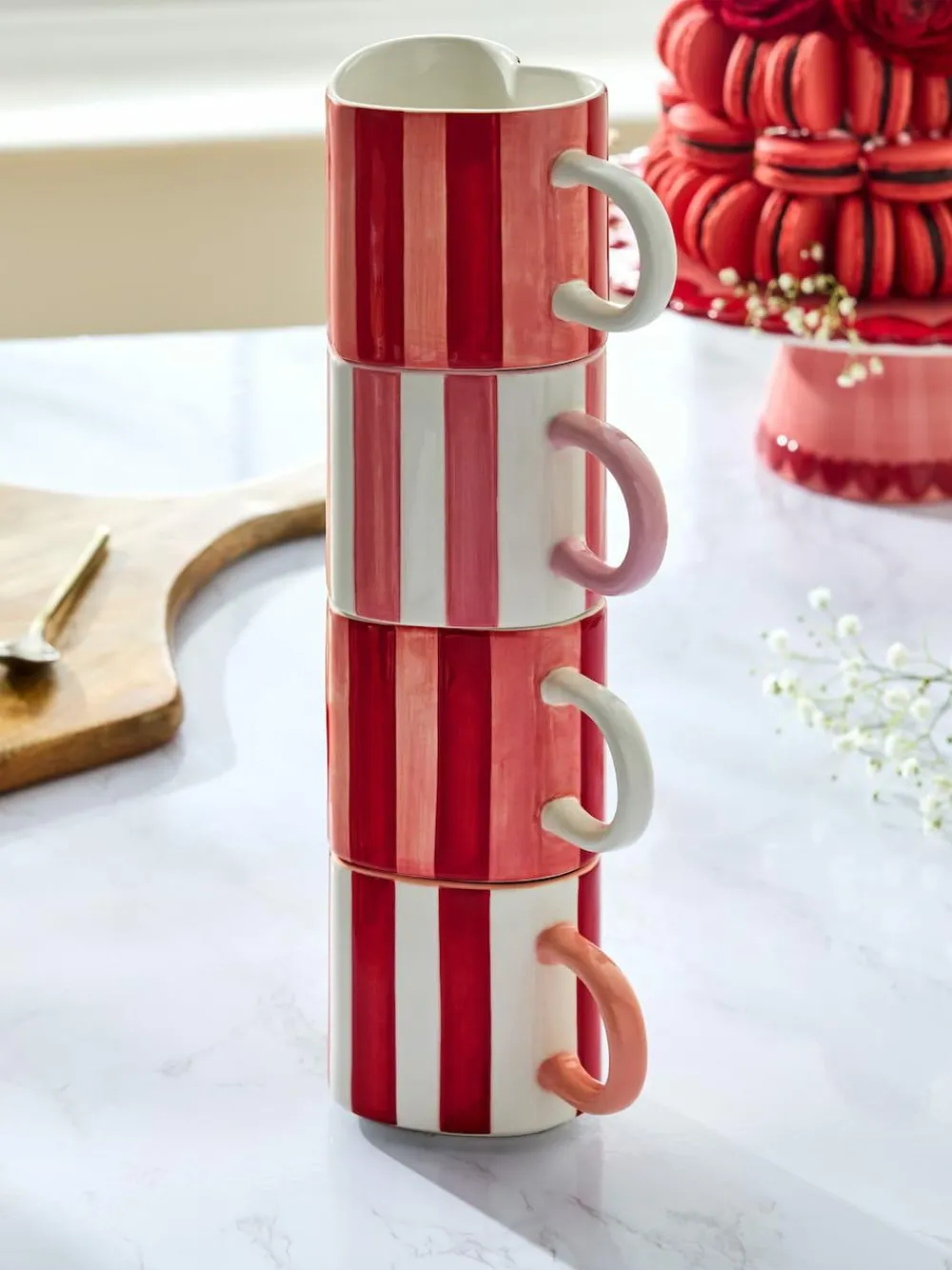Heart-shaped mugs Hand painted stripe pattern on the front Contrasting hand painted inner and handle Can stack the mugs for easy storage solution Add some love to your mug collection this season Height 13cm D/Wash and M/W safe. 100% Stoneware.