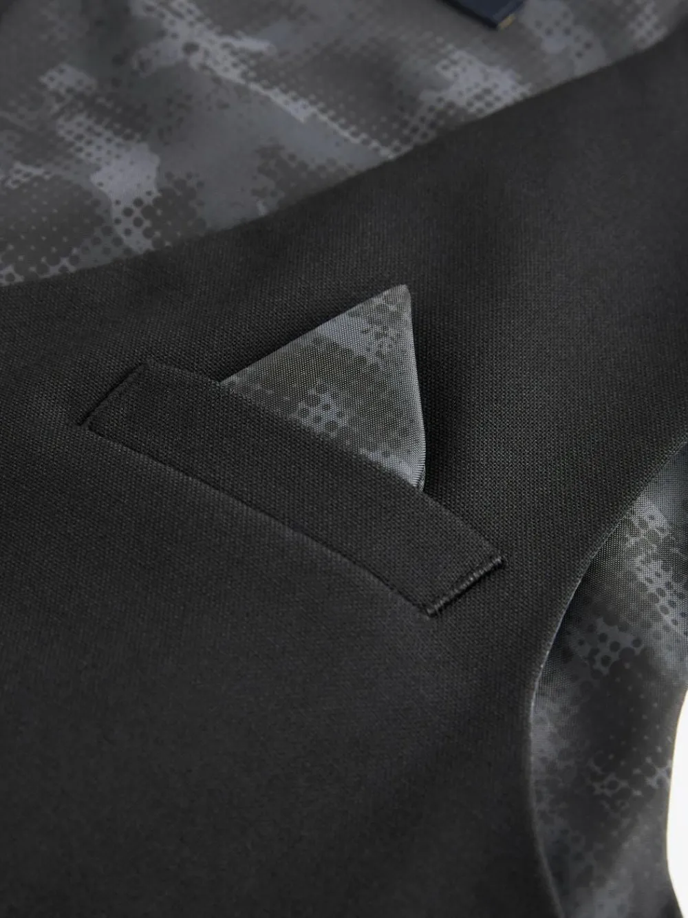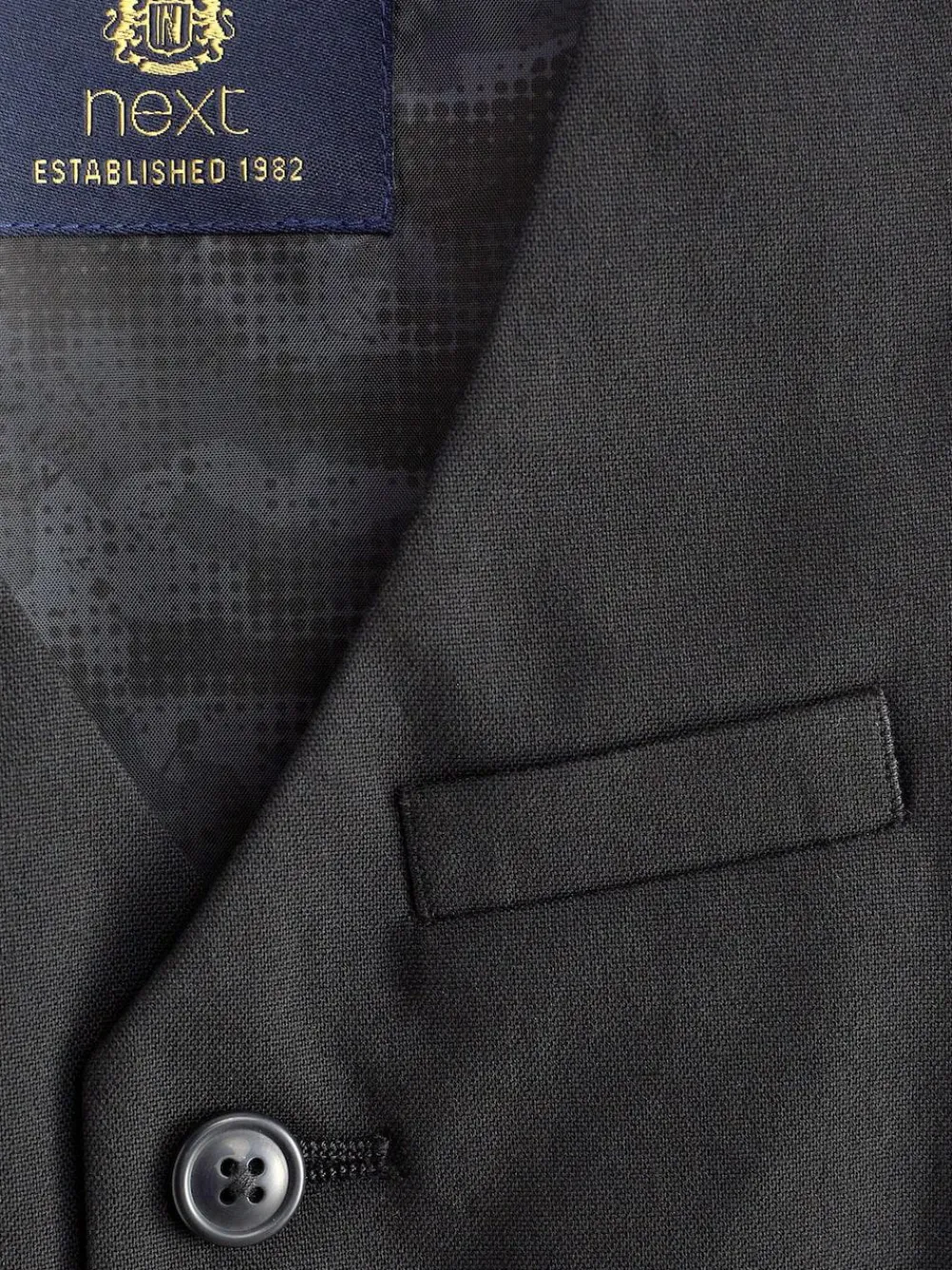 For an exceptionally smart outfit, Next’s black waistcoat makes a dapper addition to their occasion wear wardrobe. Perfect for partywear, this waistcoat can be easily worn over their favourite shirt or t-shirt for an instant party update. Designed with a tailored back and adjustable buckle, it has smart jetted pockets to the front, shiny 4 button fastening and satin lining. If it’s an extra special event, pair with the matching jacket and trousers for a super smart look. Adjustable back buckle 4 button fastening Tailored fit Satin lining Jetted pockets Machine washable. Main 67% Polyester, 32% Viscose, 1% Elastane. Back Panel 100% Polyester. Lining 100% Polyester.
