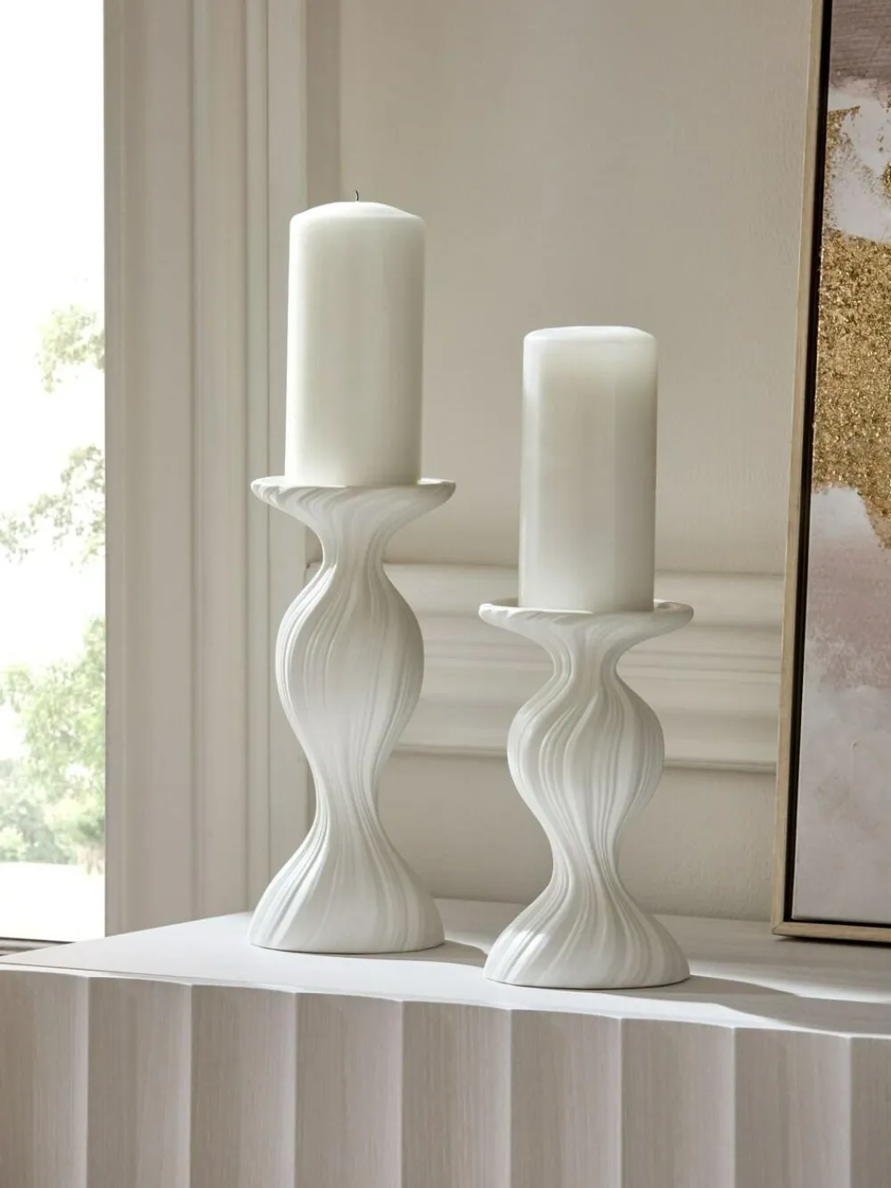 Minimalistic, yet elegant, our white pleat pillar candle holder is exactly what you need to complete your perfectly curated display. Full of movement, this crisp silhouette really sets the tone for the design-led home. Pillar candle holder Pleated design Small Height 19cm / Width 11cm / Depth 11cm Medium Height 24.5cm / Width 11cm / Depth 11cm 100% Stoneware.