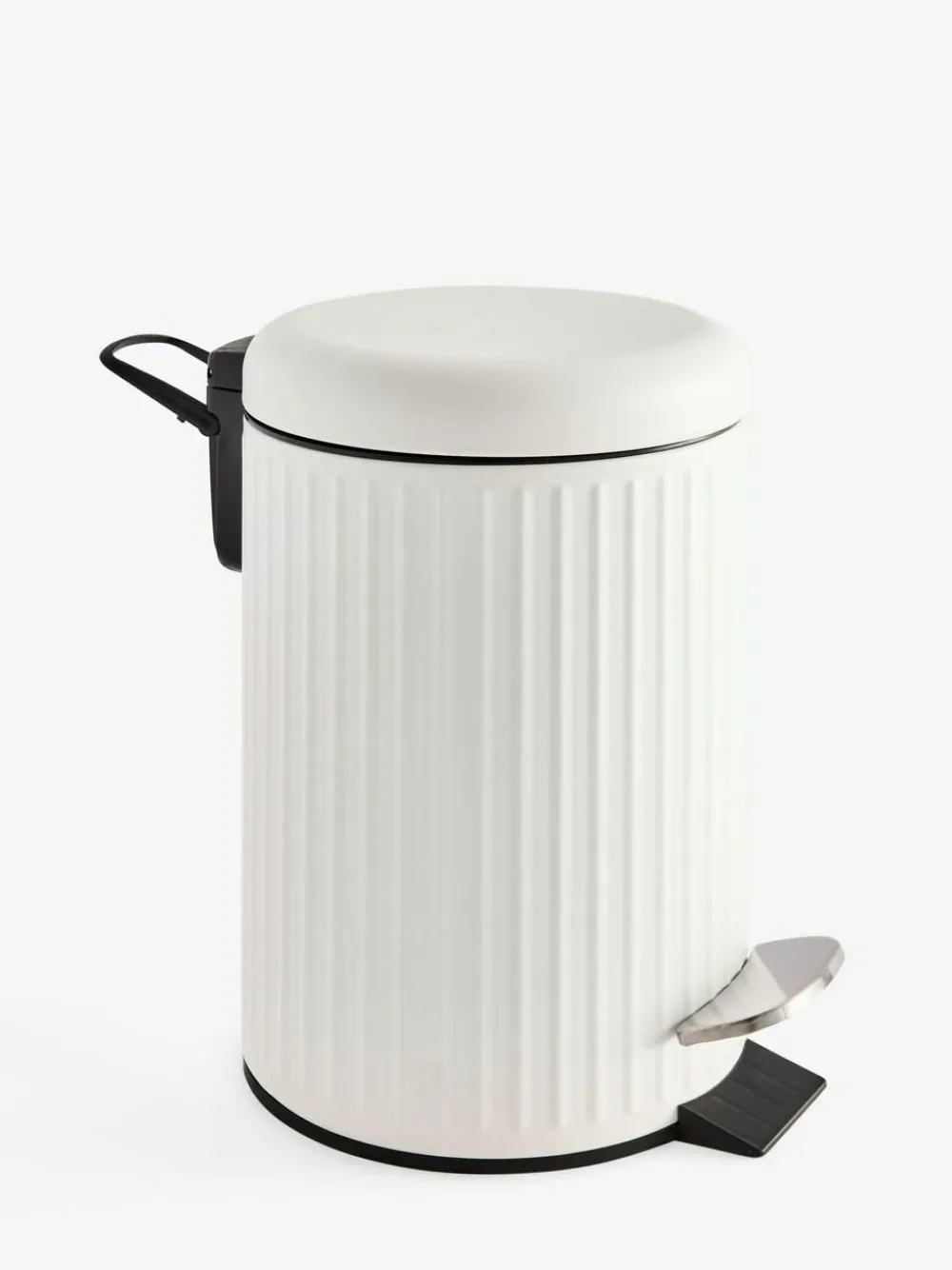 Our White 3 Litre pedal bin is a designed with a stylish rib finish and is the perfect practical addition to any bathroom or small space. With a soft close lid and handy carry handle, this bin also features a removable inner section for easier emptying.3 Litre capacityRib designPedal openingPerfect for the bathroomRemovable inner section Height 26cm Width 17cm Depth 17cm 62% Metal, 26% Plastic, 12% Stainless steel. This item has been tested to ensure it is bathroom suitable and protects against corrosion and distortion from steam.
