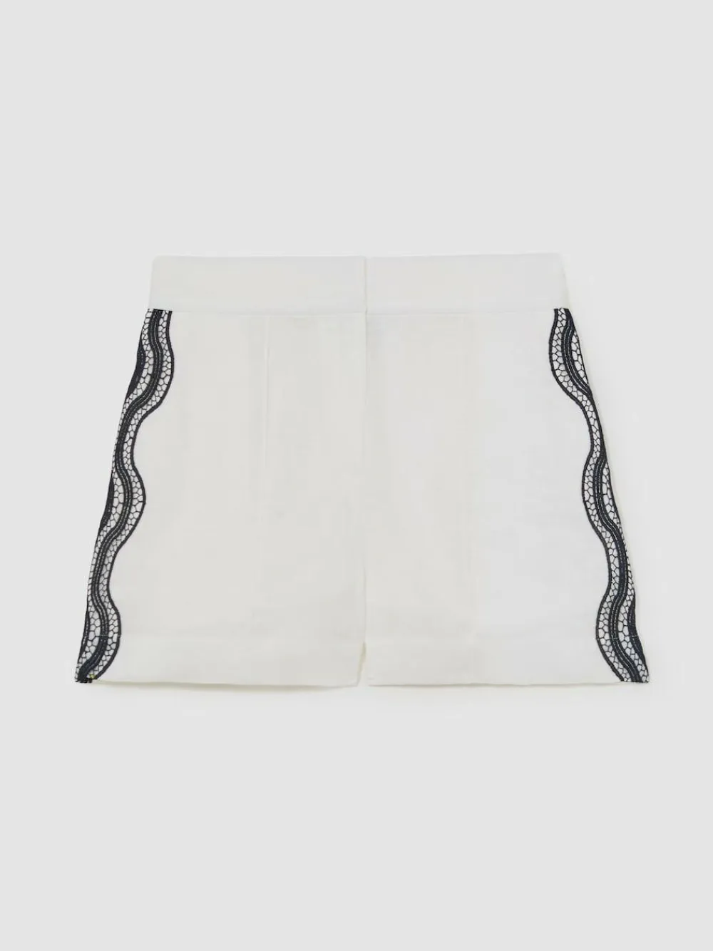 Perfect for warm weather, the Felicity shorts are crafted from 100% linen with lacy scallop trims at the sides. A topstitched waistband and subtle pintucks add a refined finish.100% linenEmbroidered lace scallop trimTopstitched waistbandHigh waistFront pintucksSide slip pocketsBack welt pocketConcealed button with zip Regular inside leg length 2″ / 5cm. Machine washable. 100% Linen.