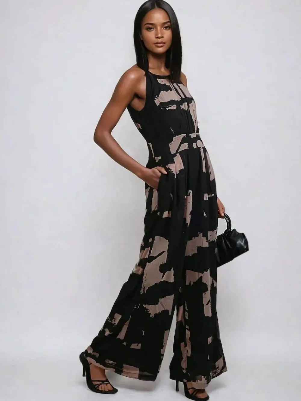 The Crew jumpsuit is the ultimate all-in-one statement piece with our customer favourite Façade print in black and ashes of roses tones. This style features a flattering halter neck with a fitted waist and a wide leg trouser with pockets. A perfect desk-to-dinner style that would also be great dressed up for occasion wear. The model wears a size 10. Length from the top: 145 cm. Regular inside leg length 57″ / 145cm. Machine washable. 100% Cotton.
