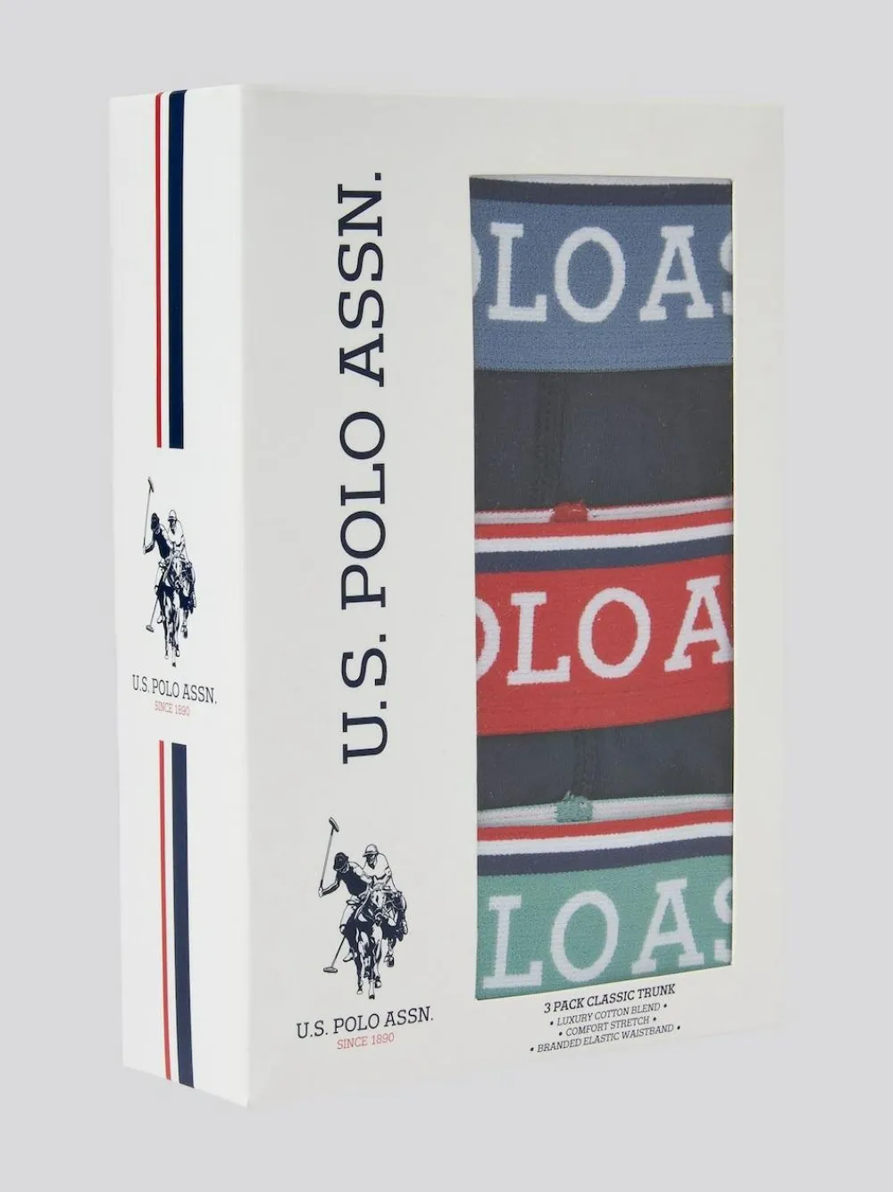 The ‘USPA Trunk 3 Pack Cotton Blend Classic Fit’ is a practical and stylish underwear essential for growing wardrobes. Crafted from a soft cotton blend with added stretch, each pair delivers comfort and flexibility, while the branded waistband adds a heritage-inspired touch. Designed in a classic trunk silhouette, this set of three is perfect for everyday wear and is neatly boxed for easy gifting or storage. Machine washable. 98% Cotton, 2% Elastane.