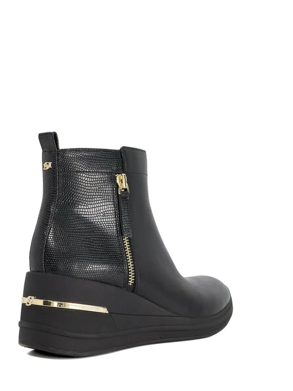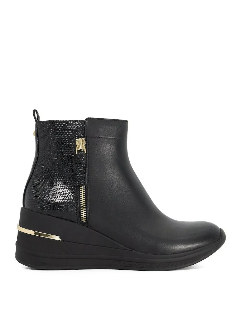 Step out in style and comfort with Everyone our black leather wedge ankle boots designed with everyday wear in mind. Featuring a sleek silhouette with a gold insert for a touch of luxe they re detailed with a side zip and rear pull tab for easy on-and-off. Lightweight and crafted for all-day comfort this versatile style is your go-to for effortless elevation. Main – Other Materials, Upper – Leather, Lining and Sock – Leather, Sole – Other Materials.