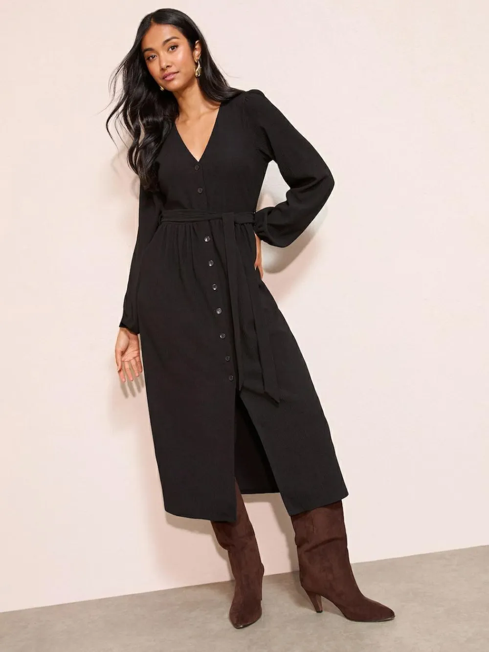 Be the first to review “Friends Like These Long Sleeve Tie Waist Button Up Textured Midi Dress Black” Cancel reply
