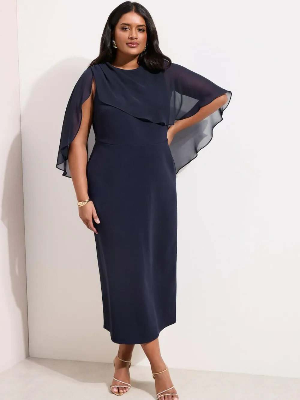 Friends Like These Navy Curve Asymmetric Chiffon Cape Scuba Midi Dress^Women Occasion Dresses