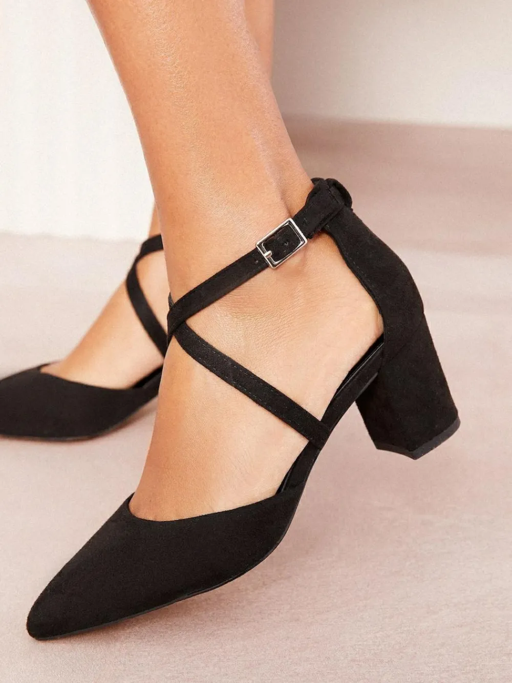 Step out in comfort and style with our block heel court with elegant cross strap detailing. Ideal for your workwear wardrobe, or for that occasion where you need an added bit of glam. Featuring: Cross strap detailing Buckle Fastening Pointed Toe Block Heel Faux Suede Upper – Textile, Lining & Sock – Other Materials, Sole – Other Materials.