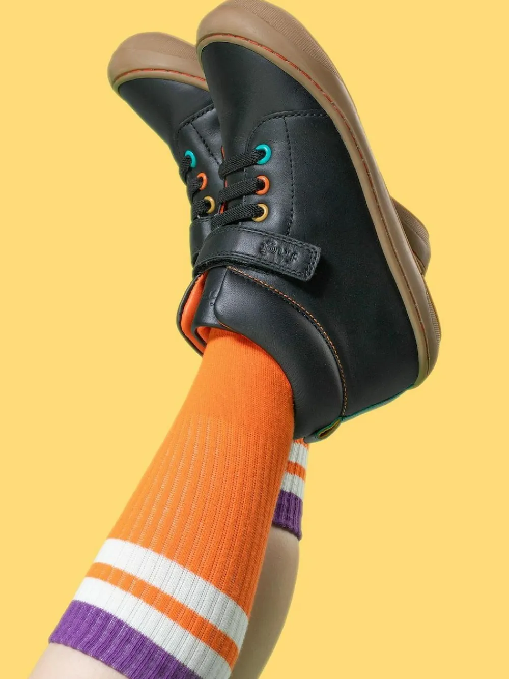 The Cape Stretch Lace Boot upper and lining is made from 100% soft, durable leather. This makes the upper and lining breathable and naturally shapes the foot for a comfortable fit. The fit around the toes allows lots of room for growing feet. Stretchy elastic laces allow for easy on and off, and an adjustable return rip tape strap creates and secure fit. A handy back heel loop helps pull the shoe on if required. The sole is both flexible and durable with a toe bump to protect the shoe from scuffs. Our footwear is tested to Frugi standards including slip resistance, sole durability and seam strength. Upper – 100% Leather. Lining – 100% Leather. Sole – 100% TPR.