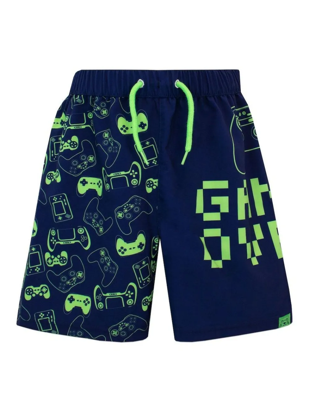 Boy’s Game Over Swim Shorts. There’s no time for avid gamers to miss a new adventure into the world of water in these amazing swim shorts. Designed by Harry Bear, these swimming trunks feature an all-over game controller motif down one leg and the wording ”Game Over” underneath a game controller on the other in neon green. Complete with vibrant green drawstrings and an elasticated waist for ultimate comfort to explore a new chapter of their own game! Machine washable. 96% Polyester, 4% Elastane.