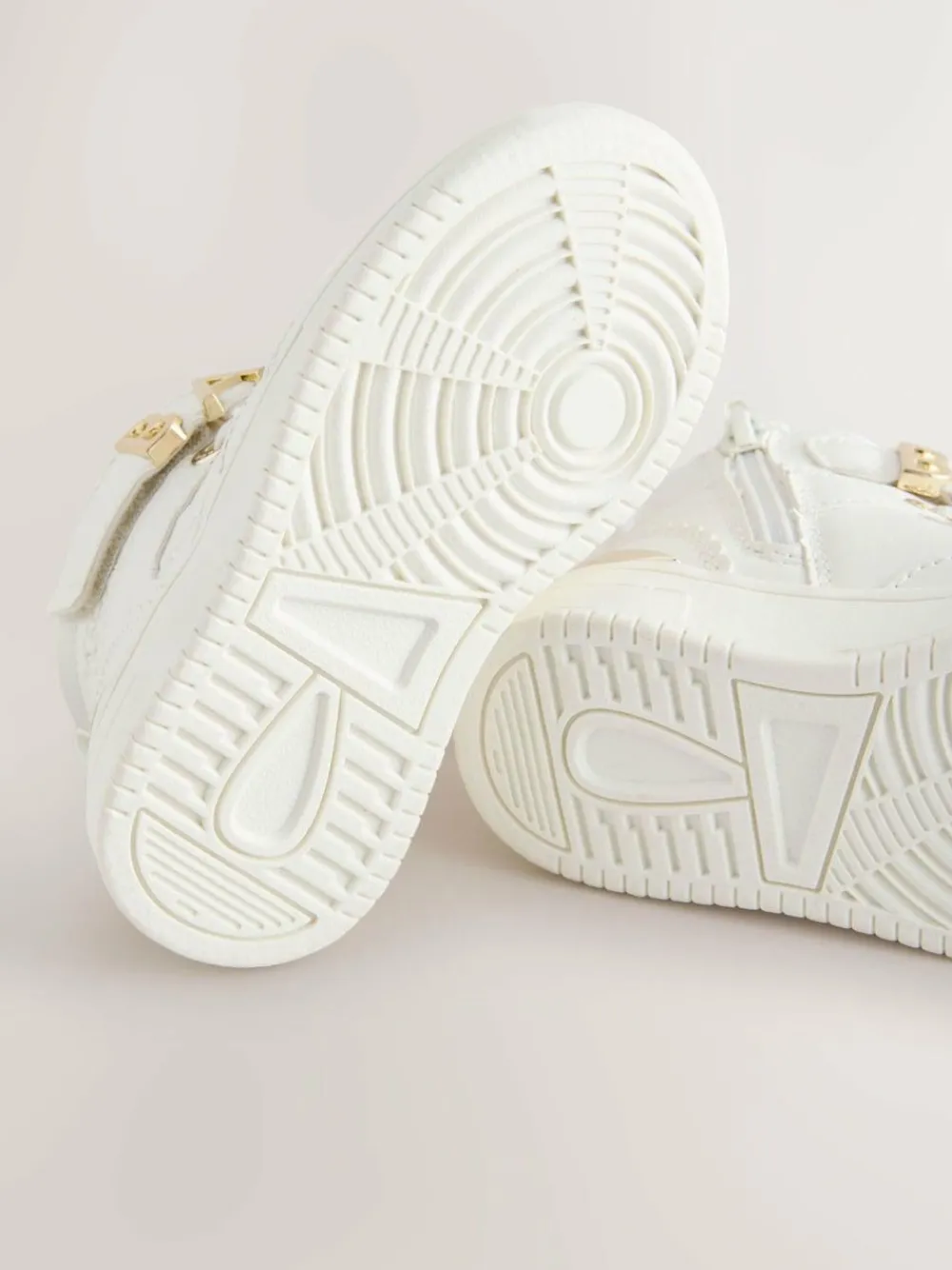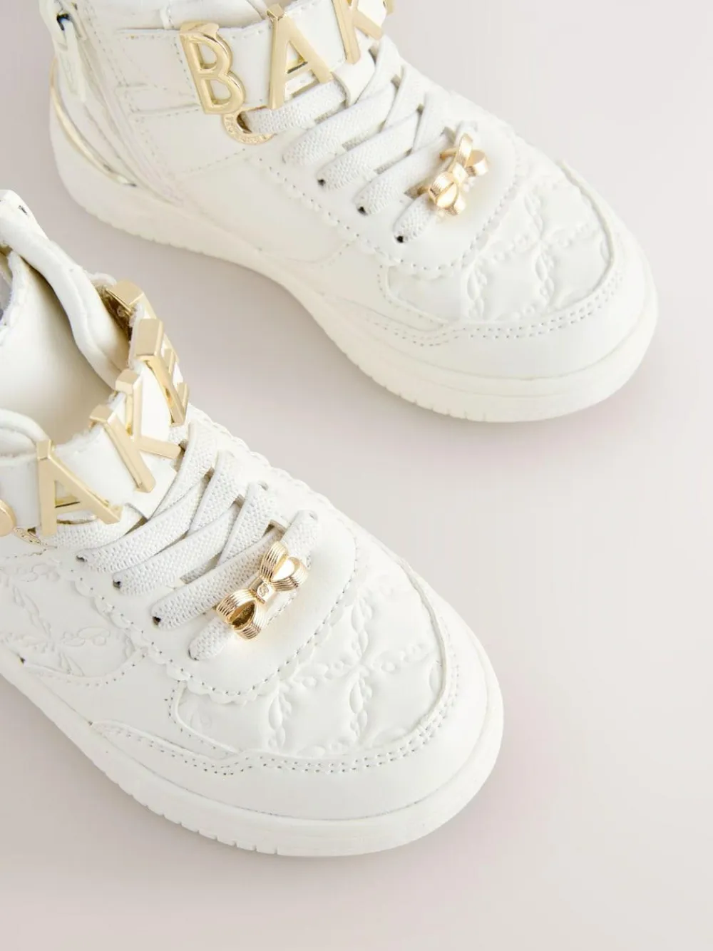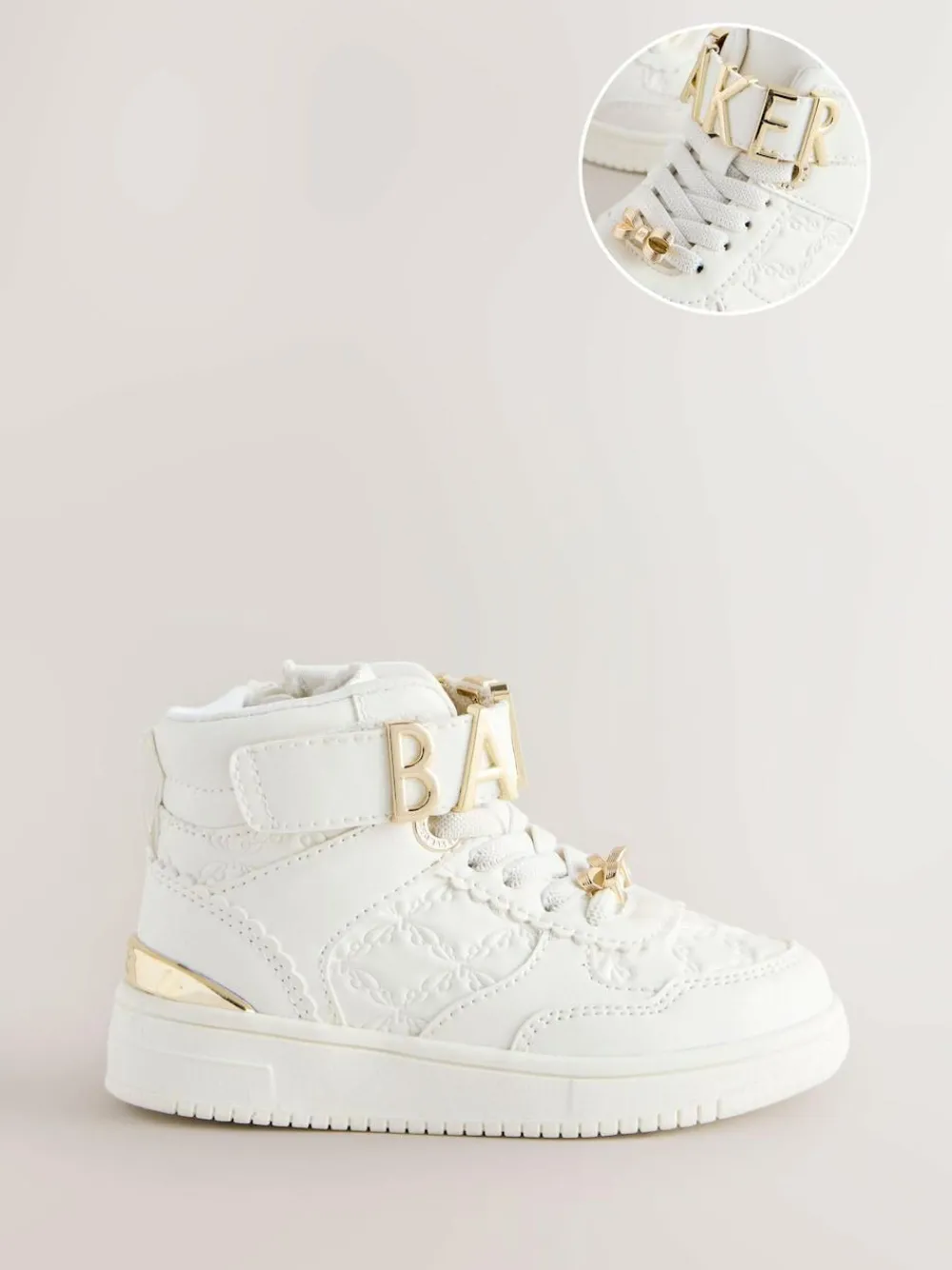 Elevate her footwear collection with these chic and stylish Baker by Ted Baker Girls White Charm Hi-Top Trainers. These trainers feature a crisp white hi-top design with a textured embossed upper and pretty scalloped edge detail on the sides and tongue for a touch of elegance. Designed for both style and practicality, they include an elasticated lace-up detail and a convenient side zip for ease of dressing. Finished with a secure touch and close fastening that showcases prominent Baker branding, these trainers stand out with their eye-catching gold Baker branded trims and a trendy chunky sole. Scalloped detail Touch and close fastening Side zip Chunky sole Upper – Other Materials, Lining and Sock – Textile, Sole – Other Materials.