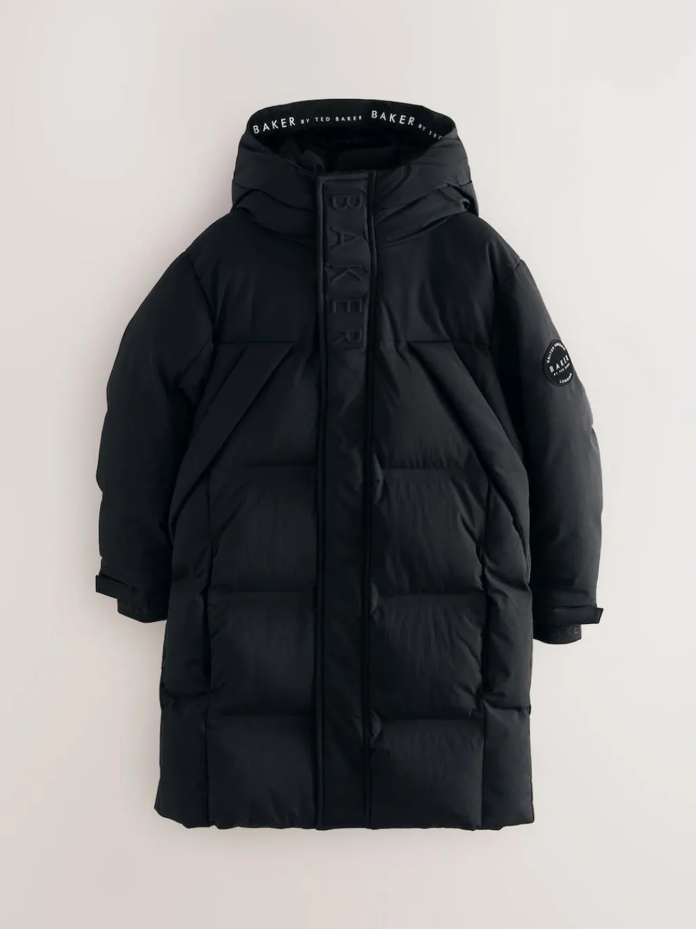 He will brave the elements in style with the Baker by Ted Baker Black Shower Resistant Longline Padded Coat. This coat is designed to offer exceptional warmth and durability, making it an ideal choice for cooler days. It boasts a shower-resistant finish to keep him dry and comfortable. Signature Baker by Ted Baker detailing includes embossed branding along the placket and on the lower back of the coat, a distinct Baker branded badge on the arm, and practical branded storm cuffs to seal out the cold. Inside, you’ll find a large internal pocket and a dedicated technology pocket, along with stylish tape branding inside the hood, combining functionality with stylish design. Shower resistant Baker branding Warm longline style Shell 100% Nylon. Panel 100% Polyester. Upper Lining 100% Polyester. Bottom Lining 100% Polyester. Cuffs 94% Polyester, 6% Elastane. Wadding 100% Polyester.