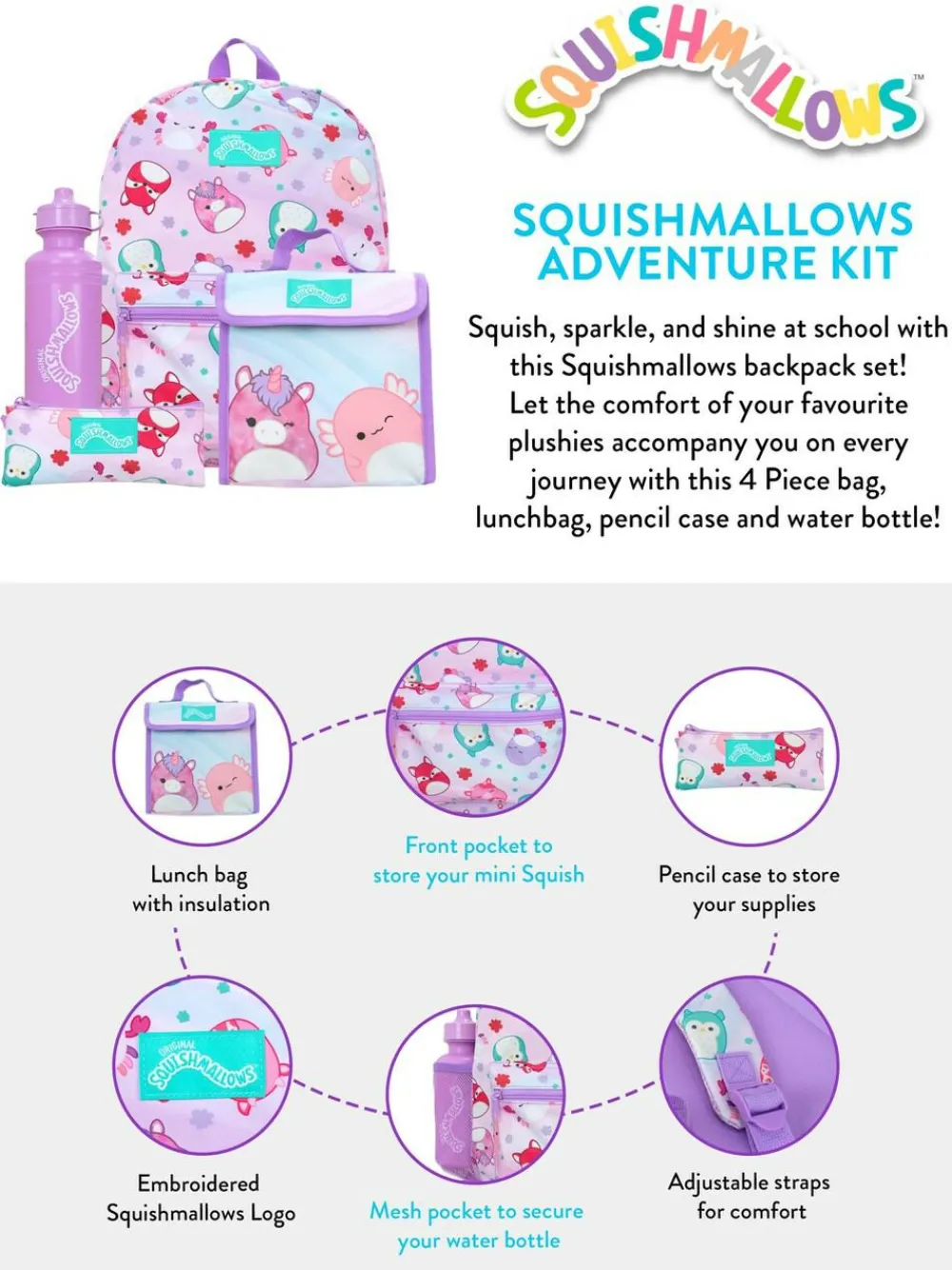 Explore the magical world of Squishmallows with our vibrant 4-piece Backpack Set in fun-filled purple and blue! Pack your school supplies in a super-cool Squishmallows backpack and matching pencil case, and keep hydrated with a stylish purple water bottle. Lunchtimes just got a lot more exciting with your new friends – a unicorn and an axolotl Squishmallow on your lunch bag. Make every school day a Squishmallows adventure! Height 38cm Width 28cm Depth 10cm 100% Polyester.
