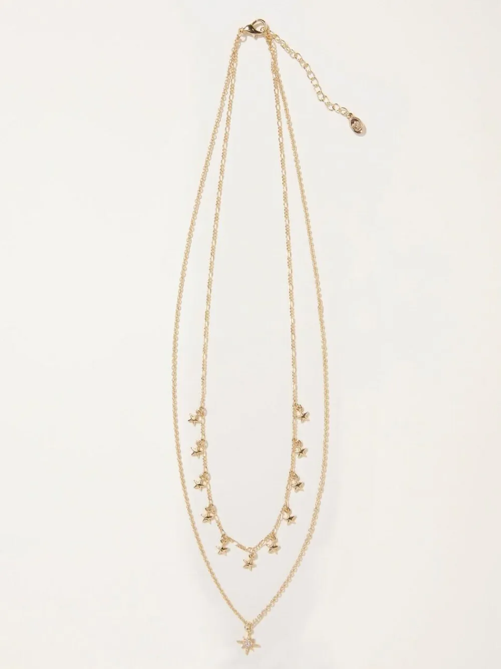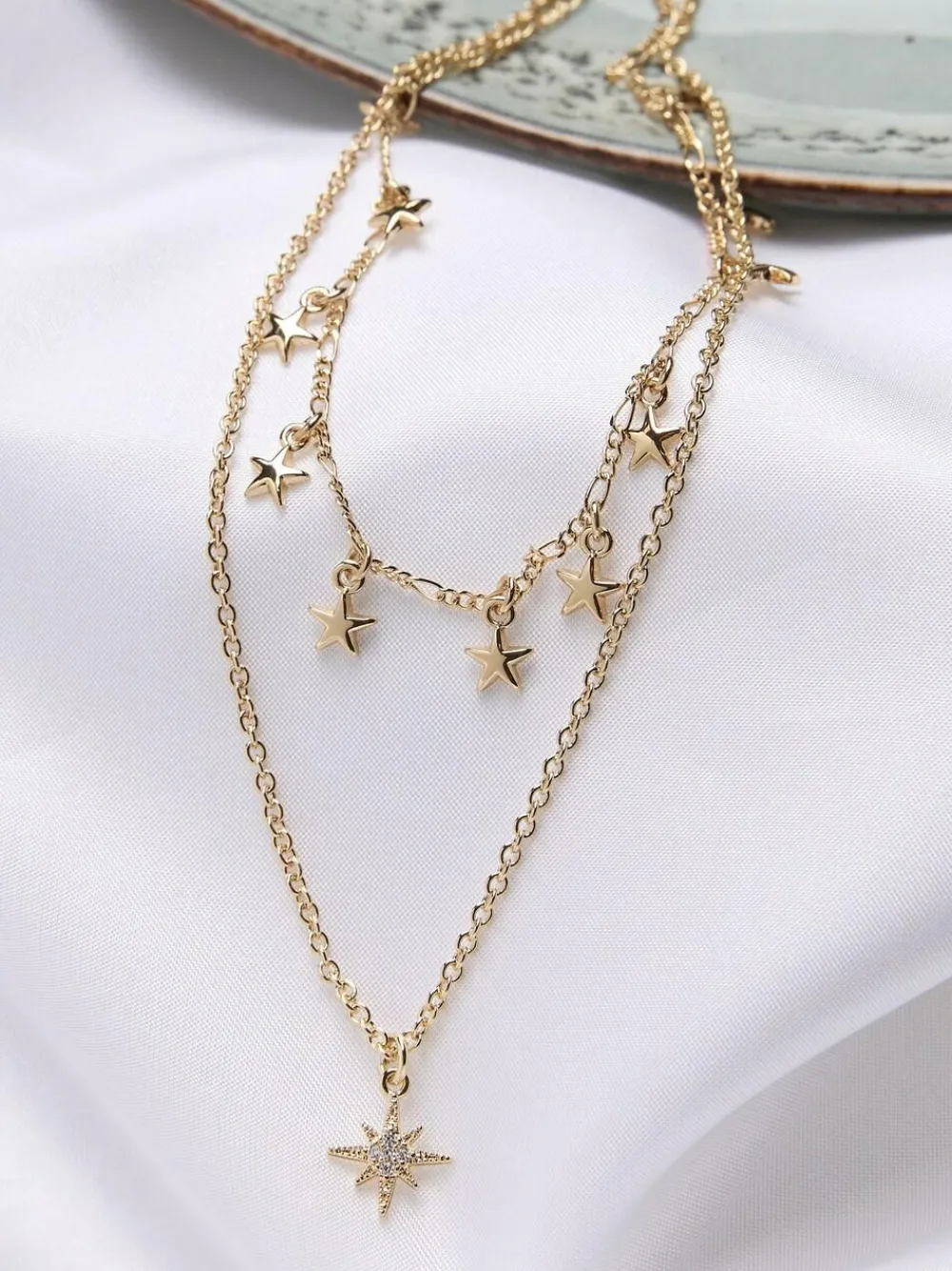 Add a touch of elegance to any outfit. With its stunning design, this star layered gold toned necklace is the perfect accessory to elevate your style, whether dressed up or down. 80% Brass, 20% Zinc.
