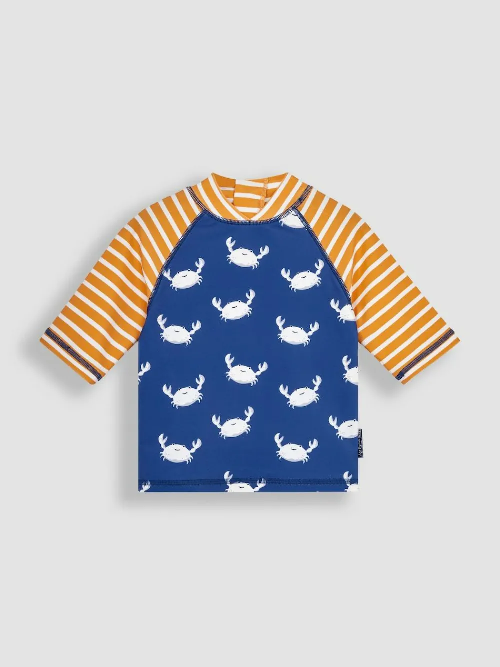 Our 2-piece Blue Crab Sun Protection Suit is an effective way to help protect children from harmful UV rays. Ideal for both playing in the sun and for swimming, it keeps covered areas safe from sunburn, enabling little ones to enjoy playing outside in the sun for longer. Lightweight, quick-drying fabric makes the sun suit even more practical, and the spritely design will delight kids. 2-piece set UPF 50+ (98% effective at blocking UVA rays) Lightweight Quick-drying Warning: Sun exposure causes skin damage Provides protection to areas directly covered and, to a lesser extent, areas shaded from the sun Protection offered by this item may be reduced with use, or if stretched or wet Young children are particularly at risk of sunburn because of their delicate skin Machine washable Main 80% Recycled Nylon, 20% Elastane. Lining 100% Polyester.