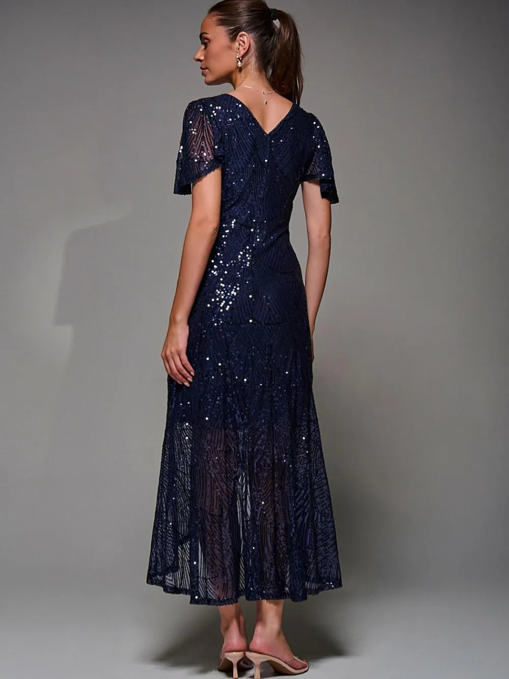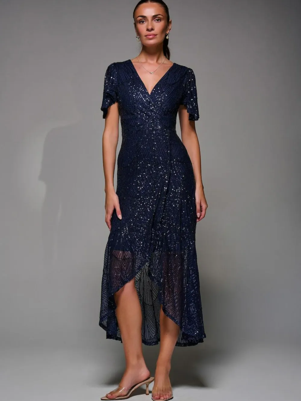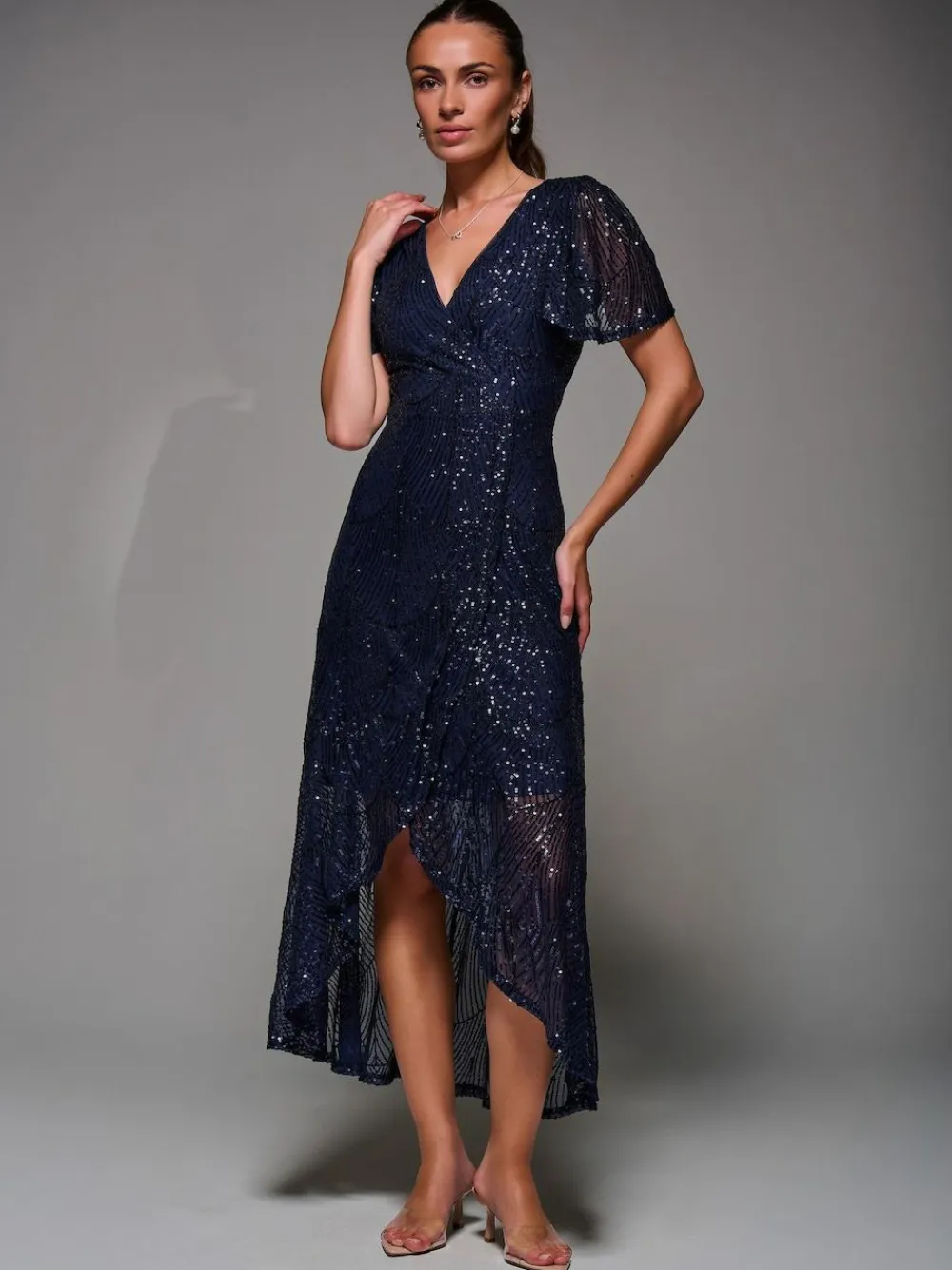 The Sequin Angel Sleeve Ruffle Hem Maxi Dress by Jolie Moi is designed with delicate sequin embellishment throughout. It features soft, short angel sleeves, a crossover V-neckline, a concealed zip, an asymmetric hem with a gentle frill, and is fully lined. Perfect for adding subtle evening glamour to any occasion. Machine washable. 100% Polyester.
