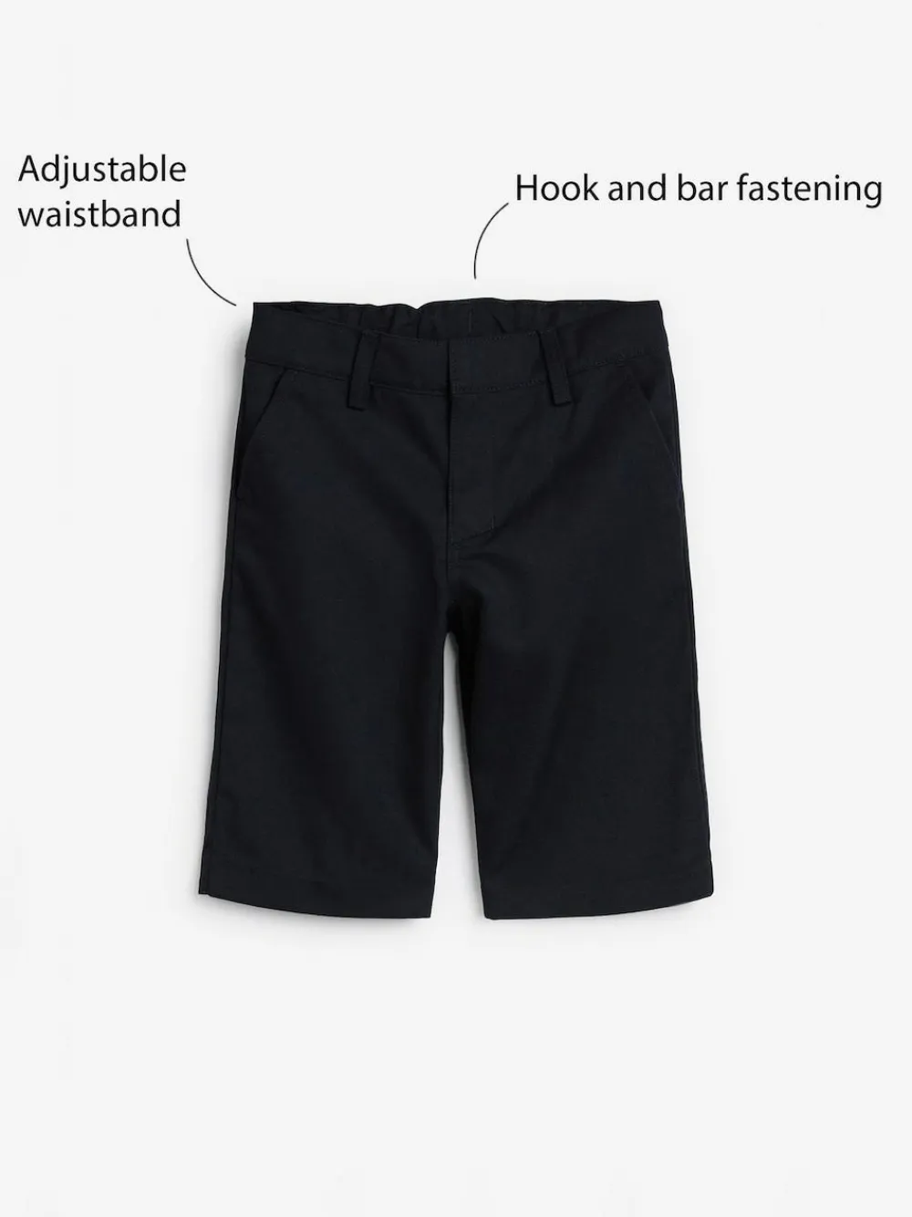 Keep him smart & stylish with these easy-to-wear school shorts. The zip fly front comes with a mock fly easy pull-on waist and the elasticated waist ensures the perfect fit. Complete with an easy iron finish, these really are the perfect pair for his summer uniform. Easy Iron Fabric – Handy easy-iron finish 2 Pack Machine washable Adjustable waist Flat front Pull-on waist option available 2 x Shorts 65% Recycled polyester, 35% LENZING™ ECOVERO™ Viscose.