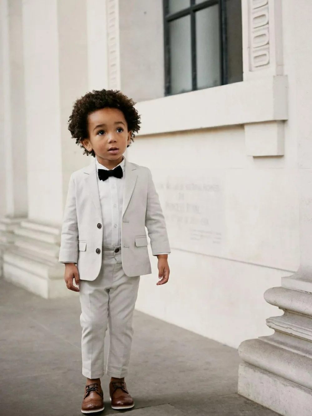 Your little one will look smart and stylish in this handy formal set, featuring a button-up shirt, a velvet bow tie, a single breasted blazer jacket with a lapel collar and coordinating center-crease trousers. Ideal for weddings, parties and special occasions. Regular fit 4-piece set Button up cotton shirt Velvet bow tie Single breasted blazer with lapel collar Smart trousers Jacket Blazer Main 54% Polyester, 23% Viscose, 15% Cotton, 6% Linen, 2% Elastane. Lining 100% Polyester. Shirt and Bow Tie 100% Cotton. Trouser 54% Polyester, 23% Viscose, 15% Cotton, 6% Linen, 2% Elastane.
