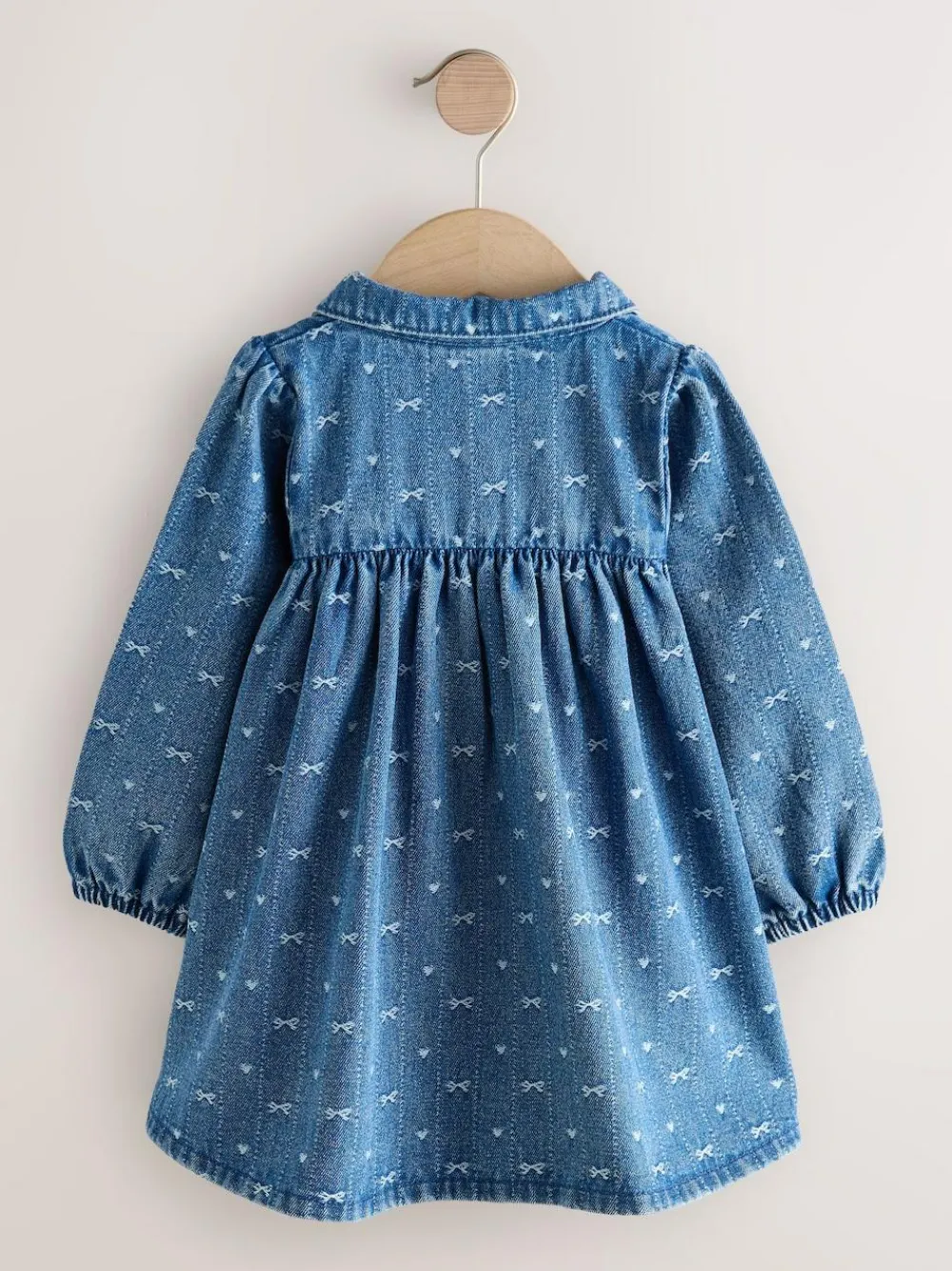 Our Denim Bow Long Sleeve Collar Dress is a timeless favourite. Made from soft cotton denim fabric with an all-over print of adorable bow motifs, this dress is comfortable for all-day wear. It features a sweet, contrast-stitched cute dolly collar and an easy half-placket of buttons at the front. The long sleeves are gathered at the cuffs, and the smock-style bodice gives way to a full skirt, creating a perfectly playful and classic look. Cute dolly collar Soft cotton denim fabric Bow motifs Button detail 66% Cotton, 21% Polyester, 9% Lyocell, 4% Viscose.
