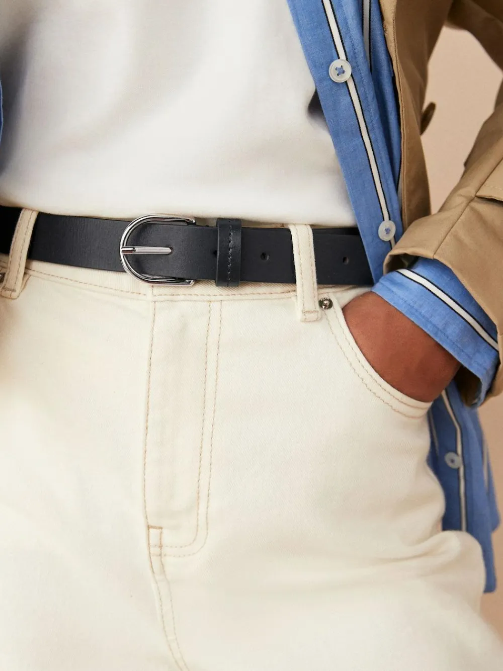 Complete your look with our leather jeans belt. Made from 100% leather, this belt is a truly versatile piece. Style it with your favourite jeans or use it to cinch in your go-to dress for a chic, pulled-together look. 100% leather Metal buckle Keeper strap 30mm wide 100% Leather.