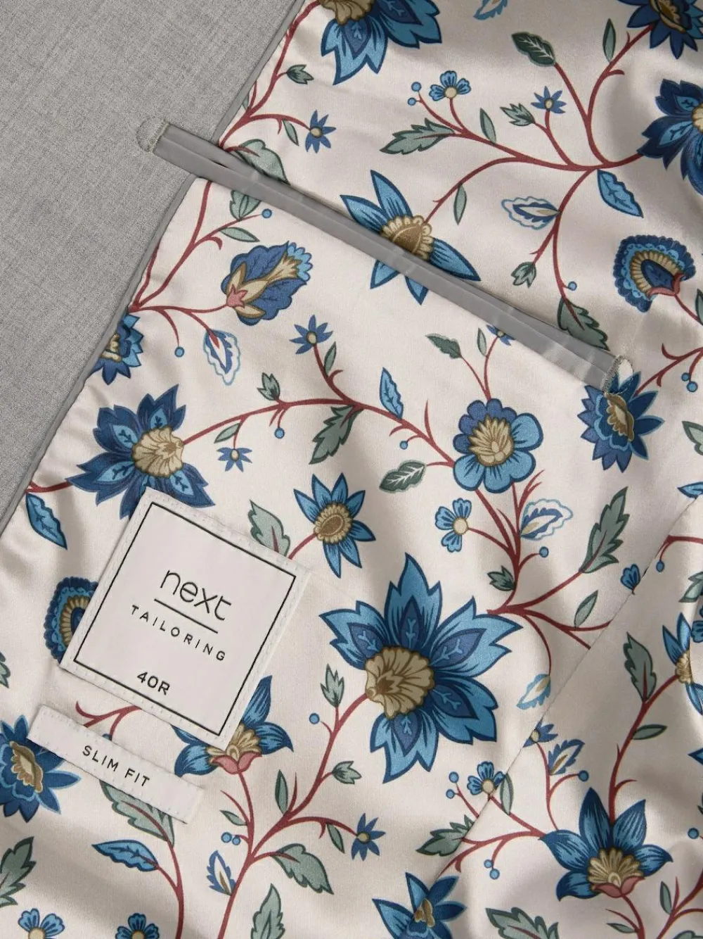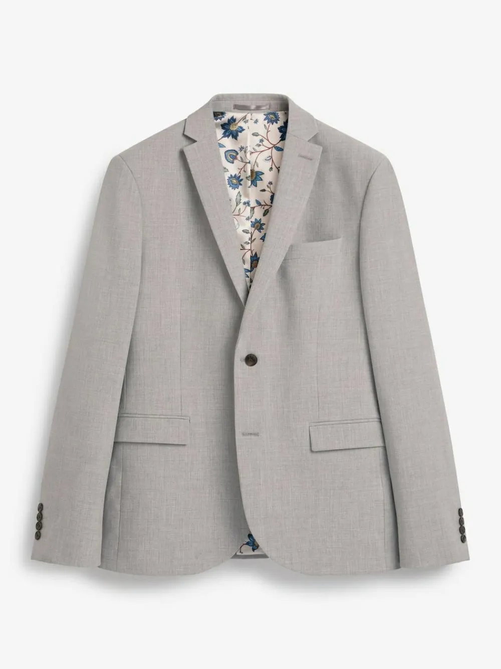 The light grey slim fit Motionflex stretch suit jacket seamlessly combines style with comfort, featuring a four-way stretch fabric that moves with you, making it perfect for busy days from desk to dinner. Its grey design adds a touch of modern sophistication, while the printed lining provides an unexpected pop of style when you take it off. Internal pockets keep your essentials secure and discreetly stowed. Stretch suit jacket Slim fit Printed lining Internal pockets Four way stretch Check out The Suit Shop for more inspiration – https://www.next.co.uk/men/the-suit-shop Dry clean only. Main 55% Recycled polyester, 34% Viscose, 7% Polyester, 4% Elastane. Lining 60% Recycled polyester, 35% Polyester, 5% Elastane.