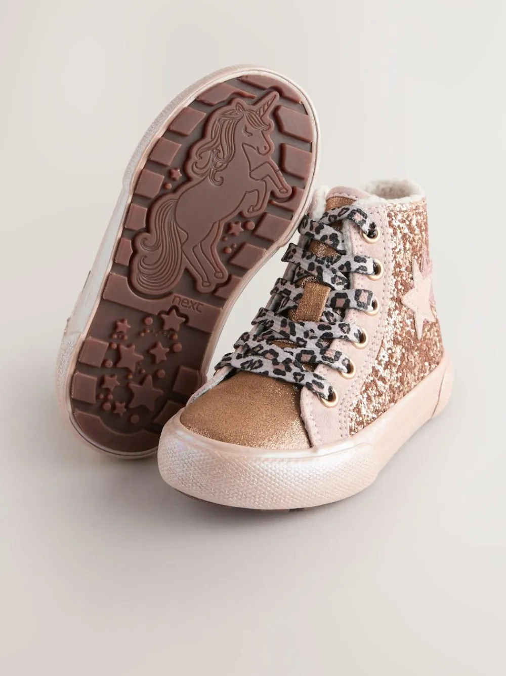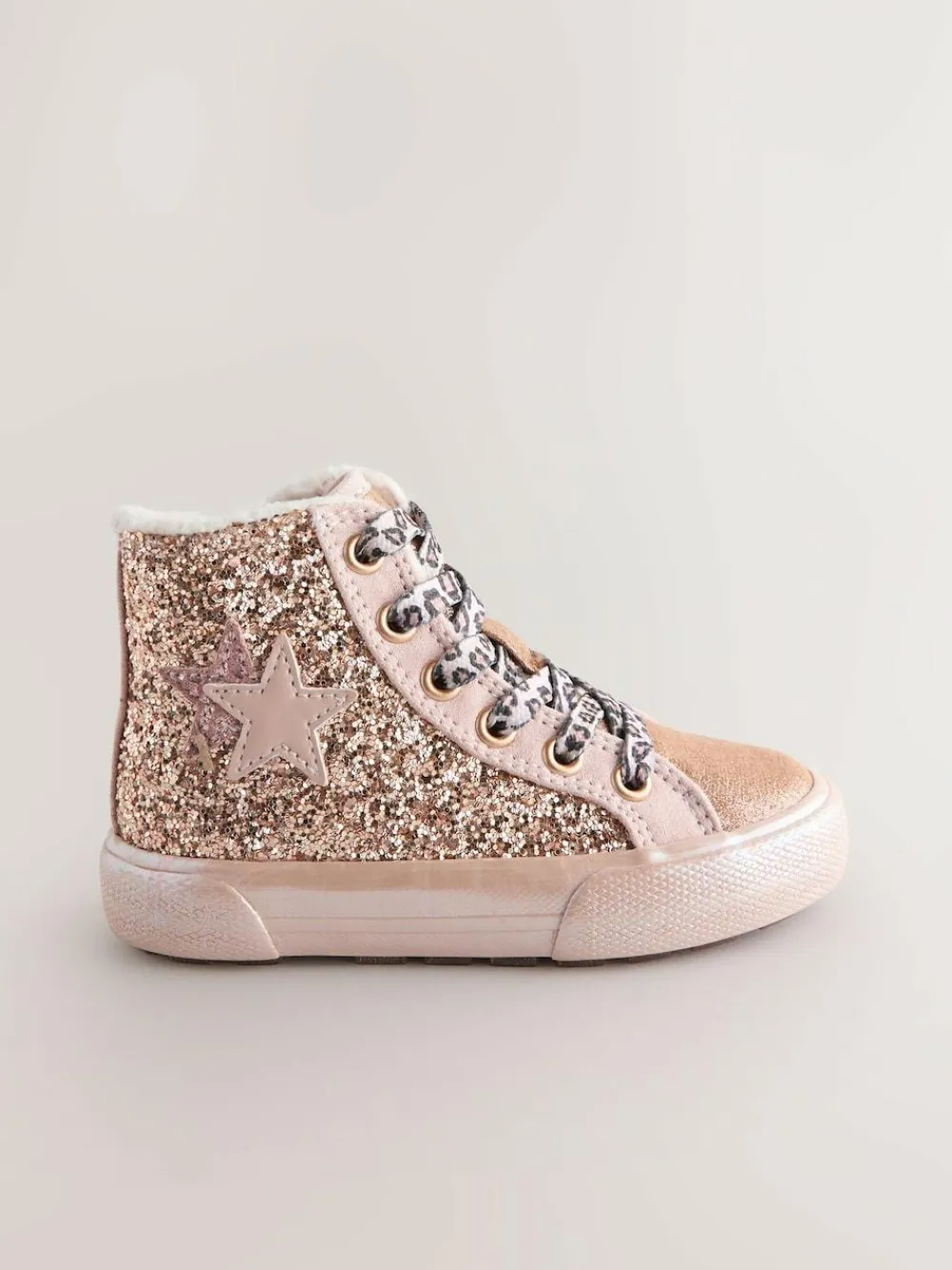Make every step a sparkling one with these Star High Top Trainers. Perfect for a party or special occasion, these trainers feature an eye-catching design with glittery details and a star motif. For a different look, they come with two sets of laces. The slip-resistant and durable sole ensures a safe and steady stride, while the convenient inside zip makes them easy to put on and take off. Sold with 2 laces Slip resistant sole Inside zip Upper – Textile, Other Materials, Lining & Sock – Textile, Sole – Other Materials.