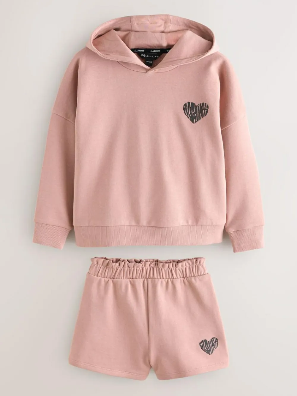 Elevate their relaxed wardrobe with the smALLSAINTS Mid Pink Lover Hoodie and Sweat Shorts Set. Expertly crafted from 100% cotton for a soft and premium feel, this coordinated two-piece features a unique AllSaints ‘Lover’ heart graphic beautifully embroidered on the chest and back. The oversized hoodie provides a contemporary, relaxed silhouette, perfectly complemented by matching shorts designed with a trendy paperbag waistband. Complete with an elasticated waist for all-day comfort, this set offers a playful yet signature aesthetic for weekend lounging or casual outings. 2 piece set AllSaints ‘Lover’ graphic Paperbag waistband Oversized fit Machine washable. Sweater Main 100% Cotton. Rib 95% Cotton, 5% Elastane. Shorts 100% Cotton.