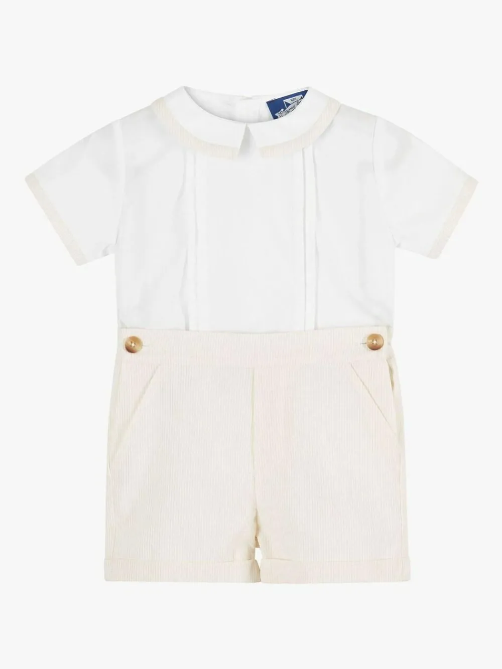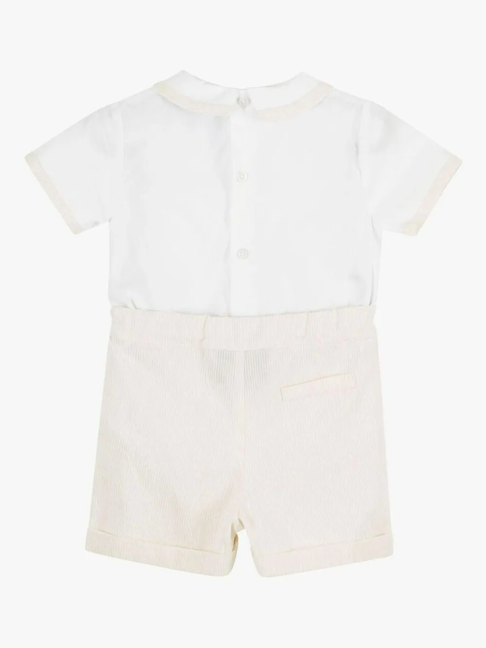 Our Rupert set includes a crisp white cotton poplin, short sleeve shirt, complete with matching oatmeal trim on the collar and pintuck detailing, which neatly fastens via concealed buttons to a classic pair of shorts. A great, all-in-one outfit for babies and young boys, it will keep little tummies under wraps and is ideal for those smarter summer occasions. Machine washable. 100% Cotton.