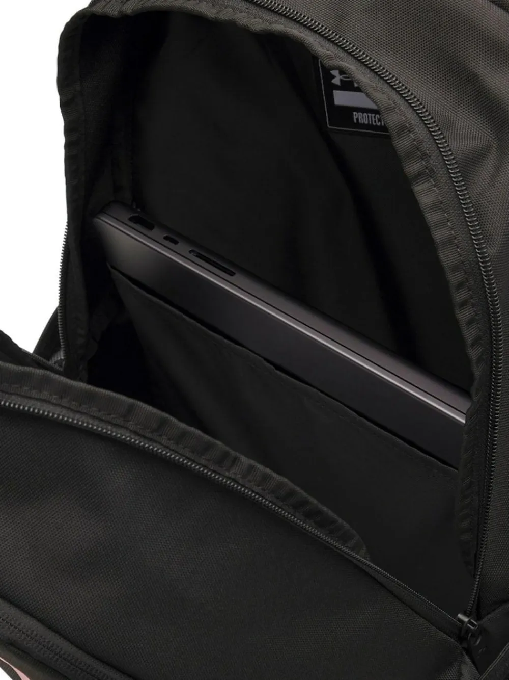 Water-resistant UA Storm technology keeps your essentials dry|Soft-lined laptop sleeve holds up to 15′ MacBook Pro® or similarly sized laptop|2 side water bottle pockets|Durable PU-coated bottom panel – Dimensions When Full: 6.7’H x 18.5’W x 12.2’D|Volume: 26.5 L| 100% Polyester.