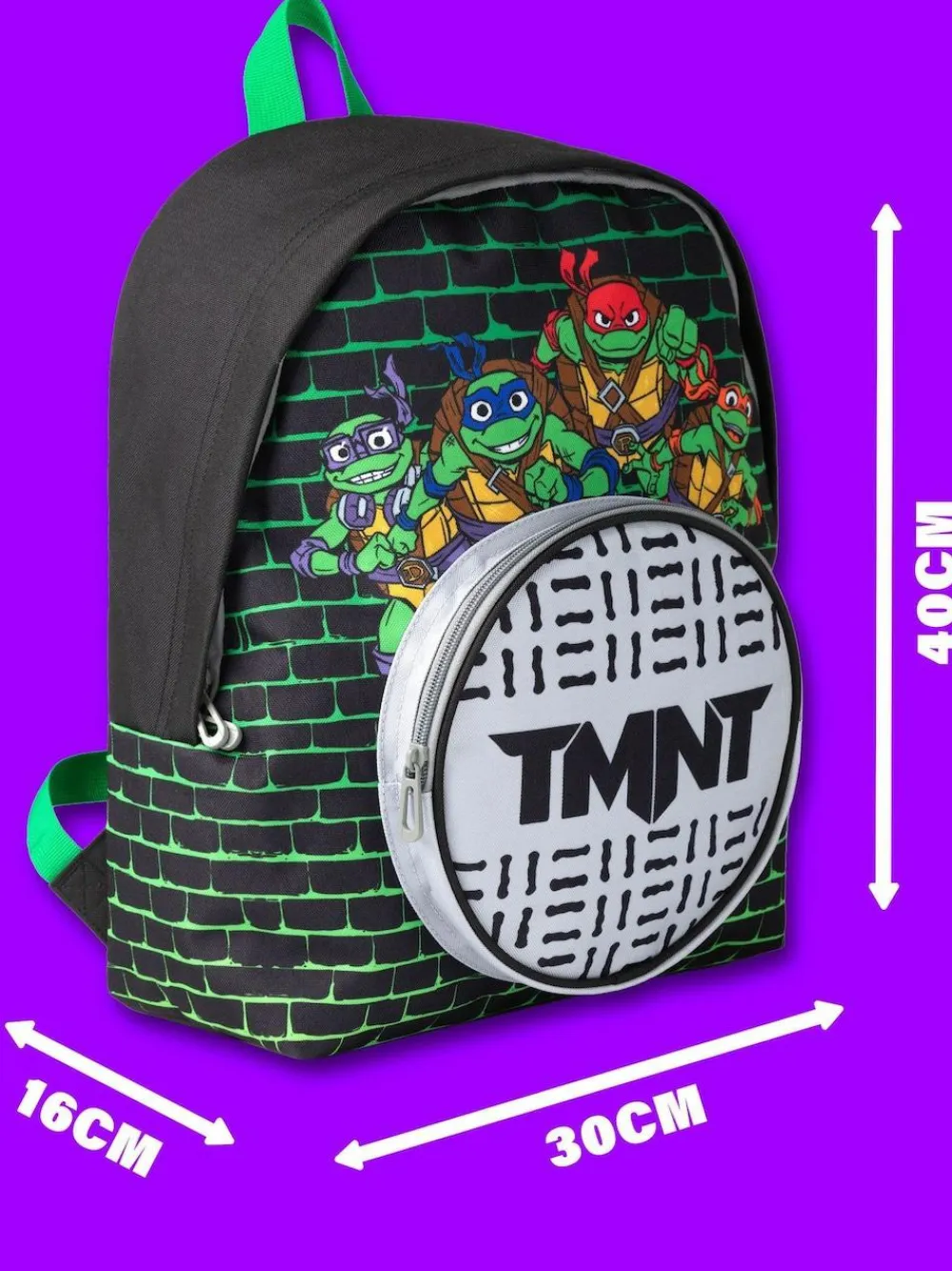 Get your little one ready for action with this Teenage Mutant Ninja Turtles backpack! Featuring a cool sewer grate front pocket, it’s perfect for any young fan of the turtles. Height 33cm Width 23cm Depth 4cm 100% Polyester.
