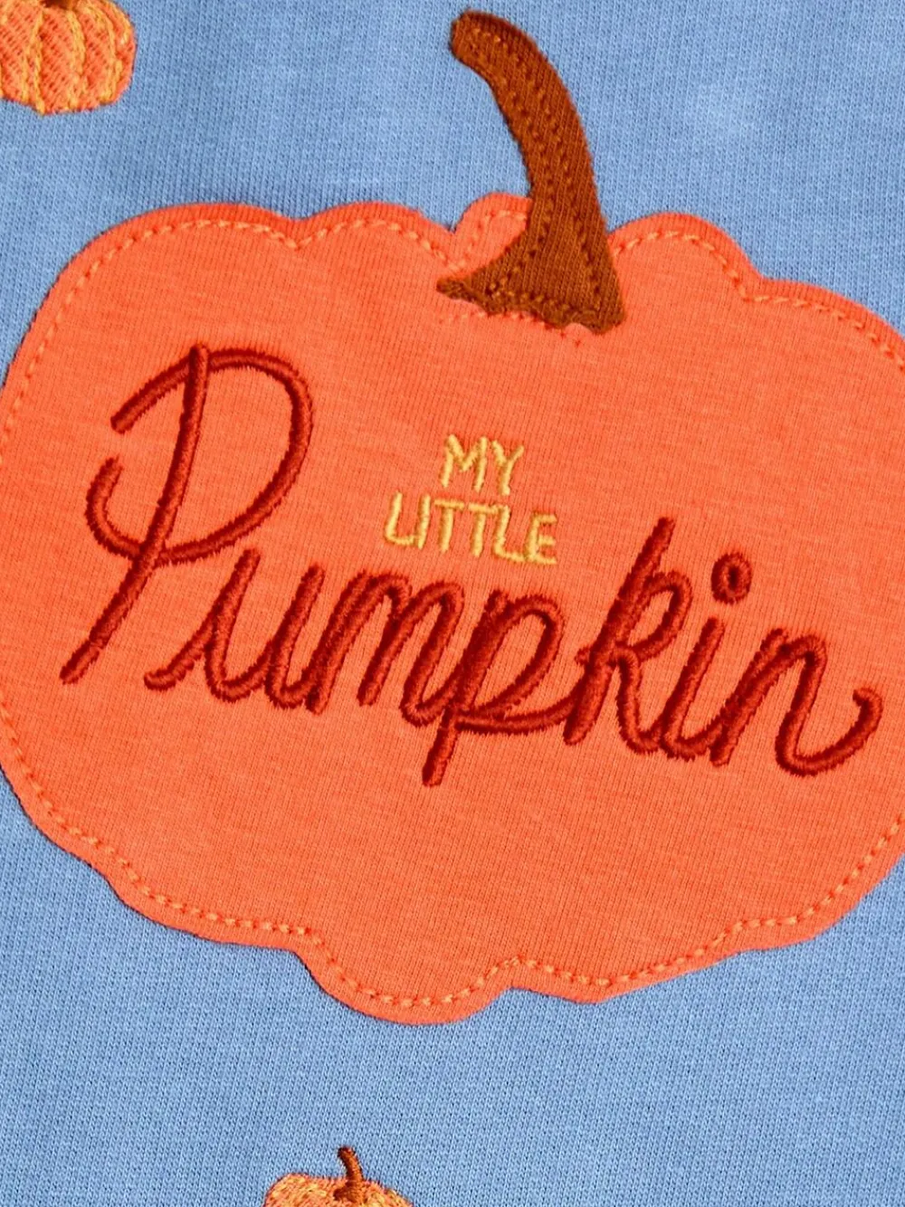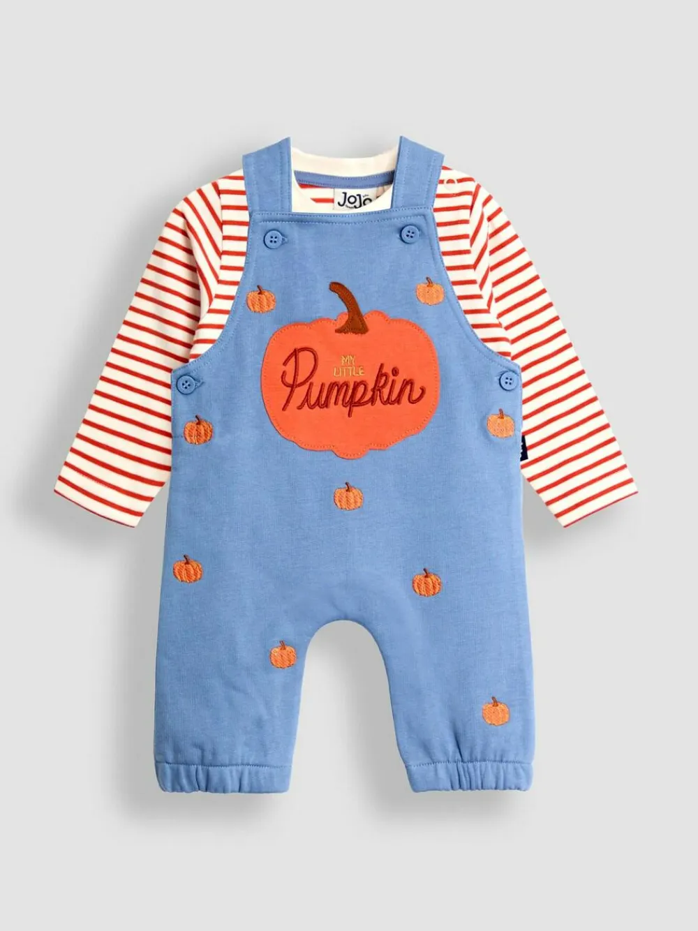 Your little one will be the sweetest pumpkin in the patch with this charming 2-Piece Appliqué Dungarees & Stripe Top Set. Bursting with a playful pumpkin appliqué design, these blue dungarees are made for pumpkin-picking days (and muddy knees, of course!) The eye-catching striped top makes this lovely little look really pop, not to mention the cosy long sleeves for those breezier outdoor play days. Blue dungaree set Pumpkin appliqué motifs Embroidered back pocket Cuffed hems Buttoned straps Side buttons for easy changing Popper shoulder opening on T-Shirt Striped long-sleeve top with contrast neckline and shoulder poppers Machine washable 100% Cotton.