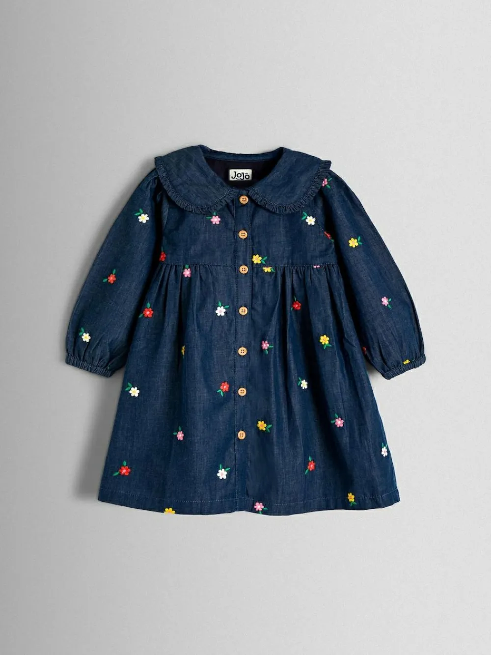 Dressing for flower-picking, picnicking days just got easier. From parties to playdates, this Embroidered Collared Dress boasts a delightfully delicately frilled Peter Pan collar for layering and looking smart as well as a floaty skirt to add volume for those twirl-worthy moments. This spring-ready style is a cottage-core look that will leave your little one feeling oh so comfy and cute!• Chambray blue dress• Button down front• Long sleeves• Floral embroidery• Peter Pan frilled collar• Machine washable 100% Cotton.