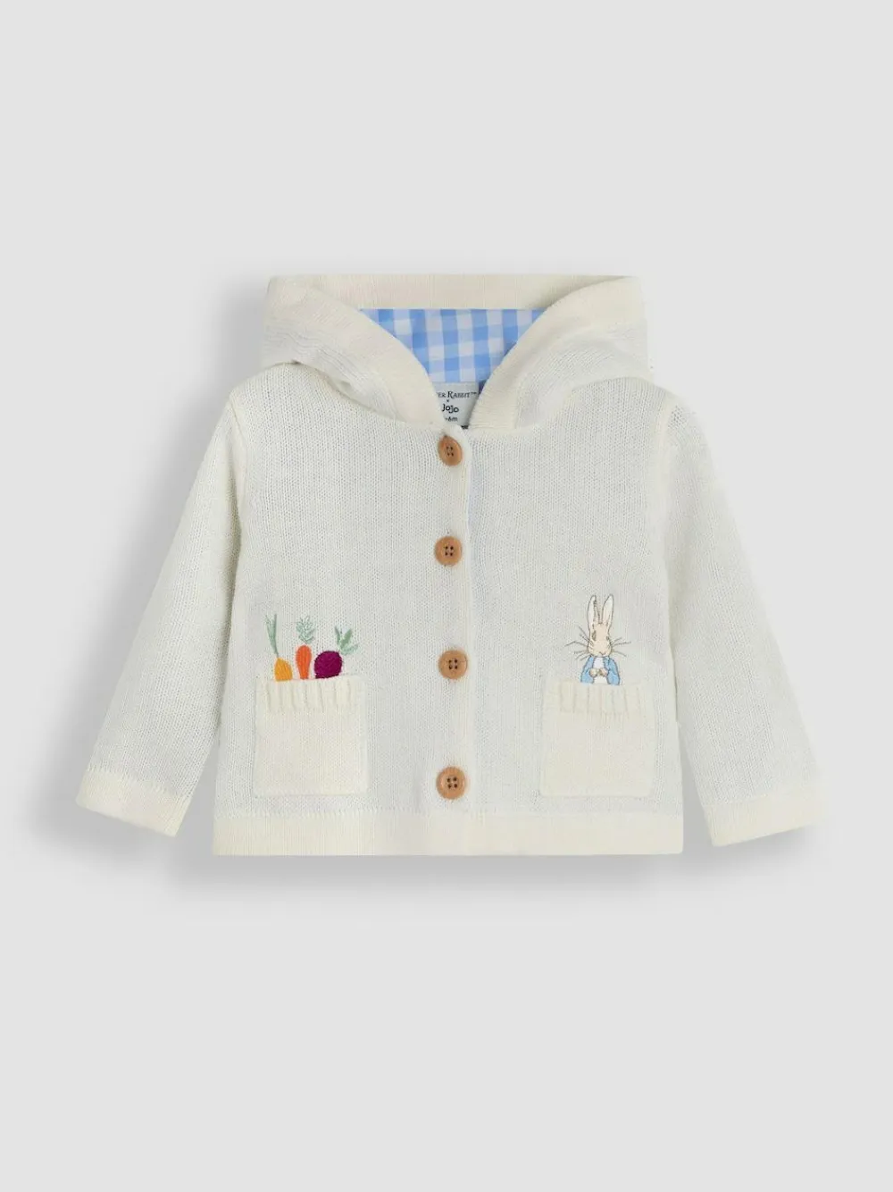 Who’s that hopping about the vegetable patch? It’s Peter Rabbit™ peeping up to say hello! And little ones will feel cosy and look oh-so-adorable bundled up in our Peter Rabbit™ Embroidered Cardigan. The design features a mischievous Peter Rabbit™ in one pocket and his vegetables in the other and has mock wood buttons down the front for simple fastening. The hood has a blue gingham lining on the inside and the little 3D ears on top give it the sweetest finishing touch, perfectly special for those blossom-scented, dewy spring days. Knit Cardigan 3D ears on hood Blue gingham lining Mock wood buttons Peter Rabbit™ design on the pockets Machine Washable 100% Cotton.