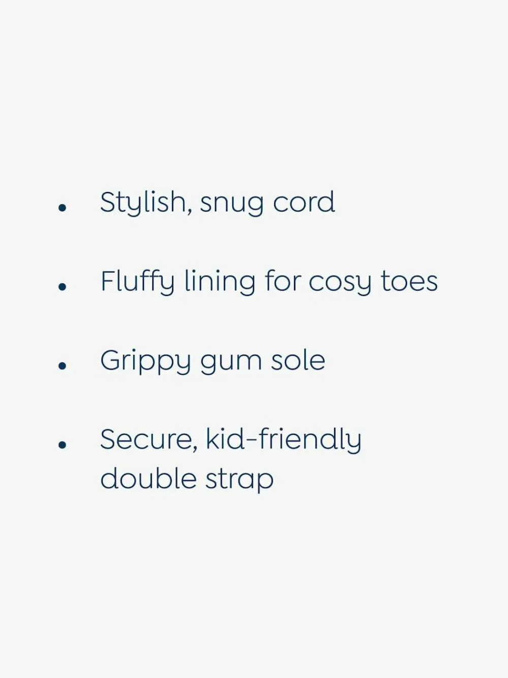Keep toes toasty on chilly adventure days with these oh so stylish and snug Cord Double Strap Cosy Lined Boots. The double cord strap keeps feet happy and snug as they dash, play and explore all day, while the fluffy cosy lining is just the extra layer of warmth they ll need on frost-crunching days. Not to mention the grown-up navy blue hue makes this a great style for those slightly smarter occasions.• Navy blue cord• Cosy lined• Double hook and loop straps• Gum sole Leather.