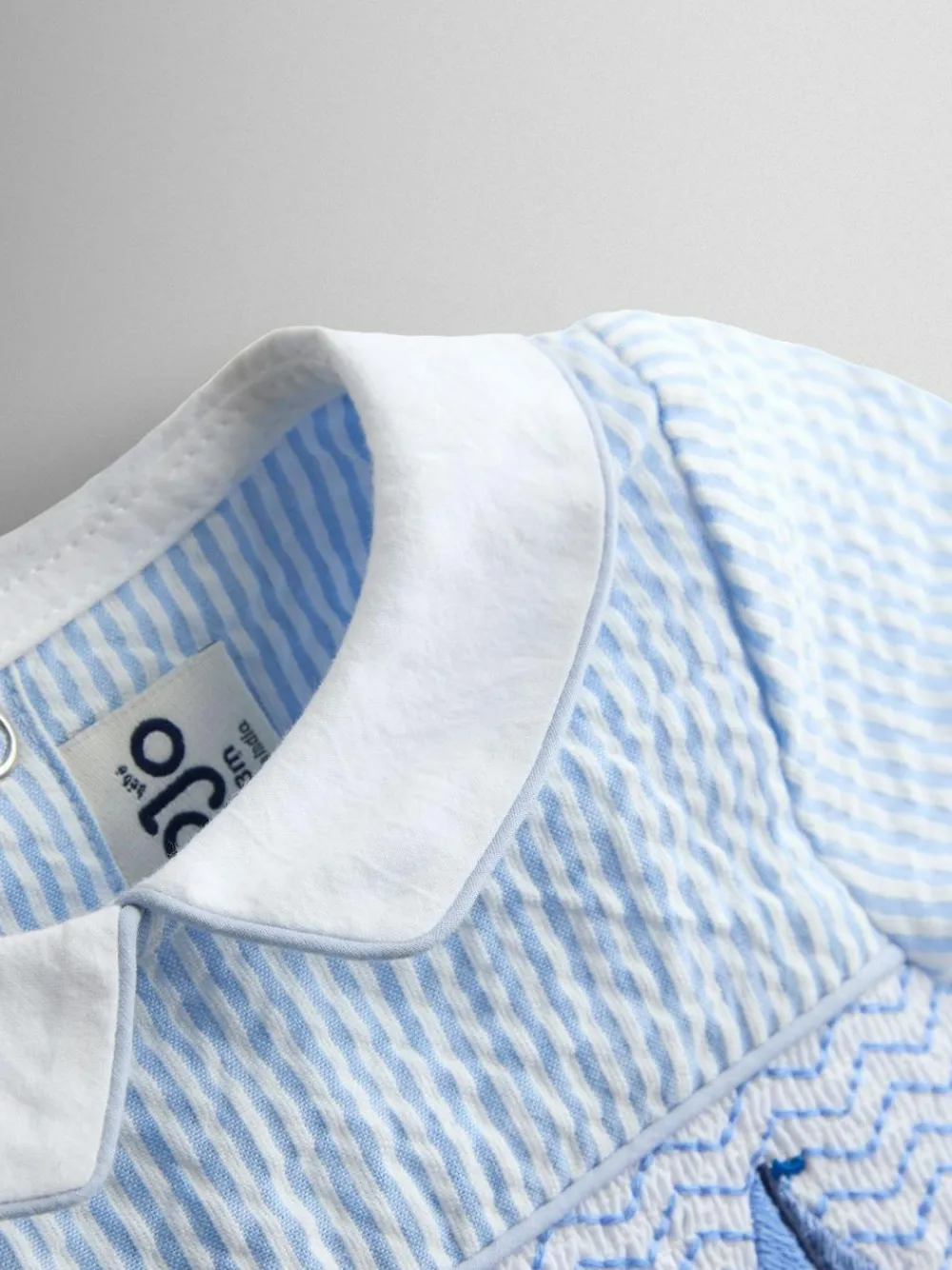 Sail away into dreamy days with this adorable Smocked Romper. With a charming collar for more dressed-up days and a breezy cotton composition to stay comfy and cool every day, this romper is a must-have all-rounder for giggly, golden moments.• Pale blue pinstripe• Smocked detail featuring sailboat embroidery• Short sleeve• Contrast white collar with piping details• Poppers at the crotch for easy changing• Machine washable 100% Cotton.