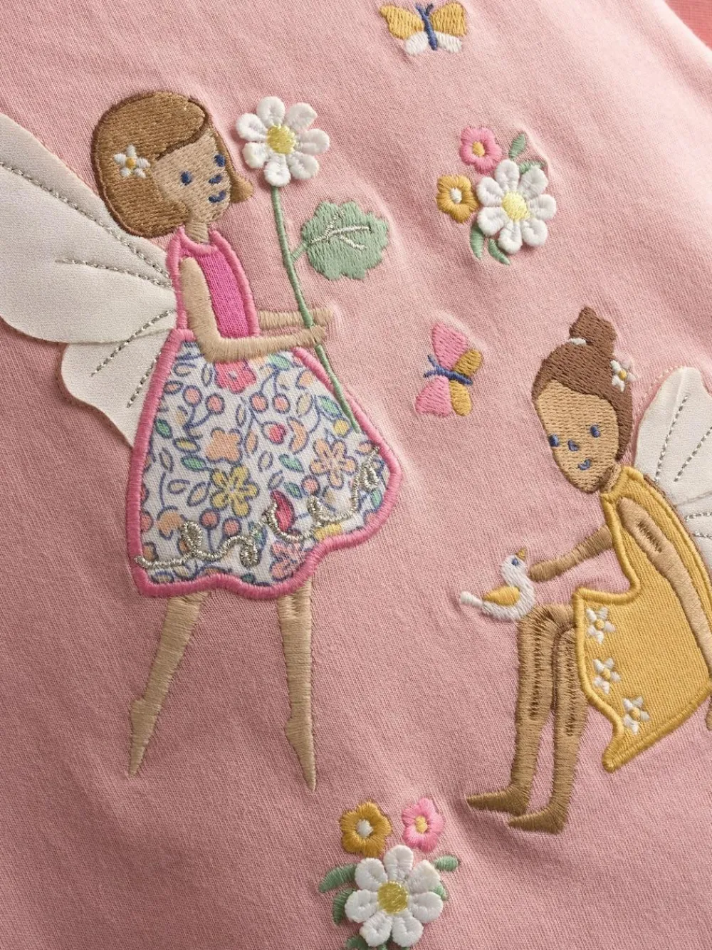 Flutter by and make a wish! This fairy Appliqué Scalloped T-shirt is an adorable pick for petal-falling days. Featuring two garden fairy appliqués tending to flowers, with stylish scalloped edging that adds an enchanting finish, your little fairy-believer can hop, skip and float around in all-day comfort.• Pink T-shirt• Fairy appliqué• Rounded neckline• Short scallop sleeves• Scalloped hem• Button at the back• Machine washable 100% Cotton.