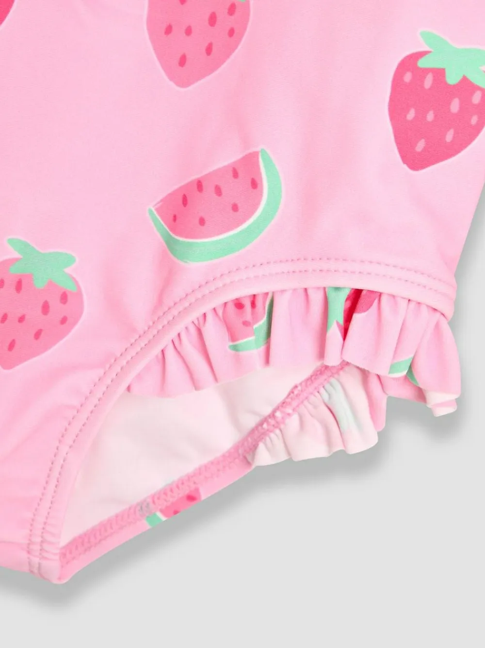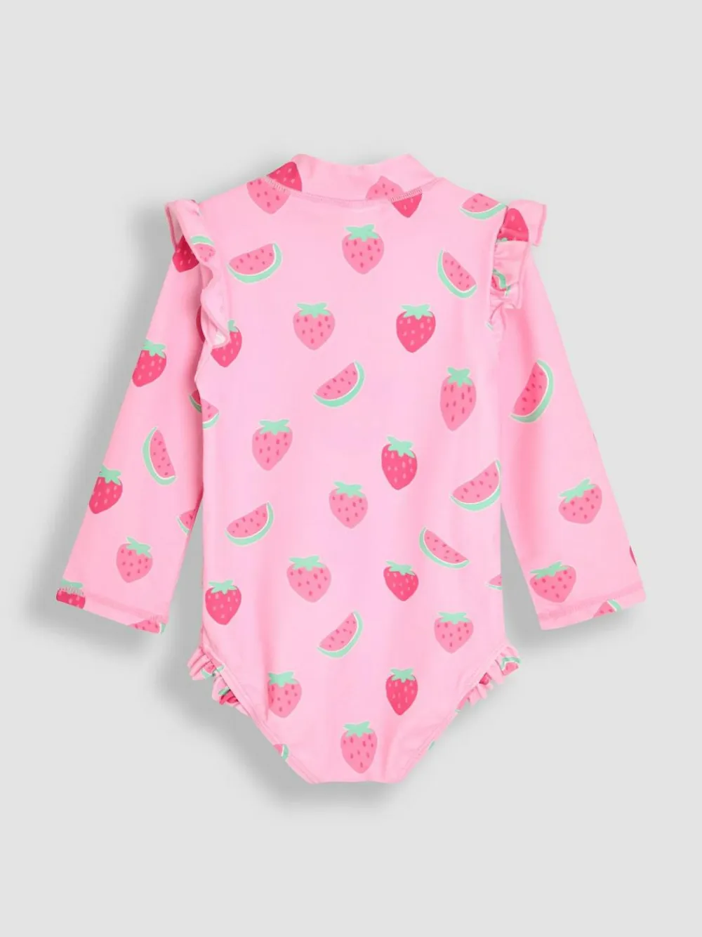 Get ready for ice lollies, beach picnics, and bucket and spade days with this Strawberry Watermelon Long Sleeve Swimsuit. Make trips to the beach or pool even more fun with the frill shoulders which adds a delicate floaty touch. Designed with UPF 50+ protection, it helps shield little ones from harmful UV rays, while the long sleeves offer extra skin coverage, as well as a little extra warmth in swimming pools. So your little water baby can splash, dash and surf in stylish citrus ready for all the water activities ahead. Pink strawberry watermelon print Long sleeves Frilled shoulders Lightweight Quick-drying Zip front opening Machine washable WARNING: Sun exposure causes skin damage. This item will only provide protection to areas directly covered and, to a lesser extent, areas shaded from the sun. Only covered areas are protected, other exposed areas of the body should be protected by a high-factor sun cream. Protection offered by this item may be reduced with use, or if stretched or wet. Sun exposure causes skin damage. Young children are particularly at risk of sunburn because of their delicate skin, babies are especially vulnerable. Keep babies out of the sun. Main 80% Recycled Nylon, 20% Elastane. Lining 100% Recycled polyester.