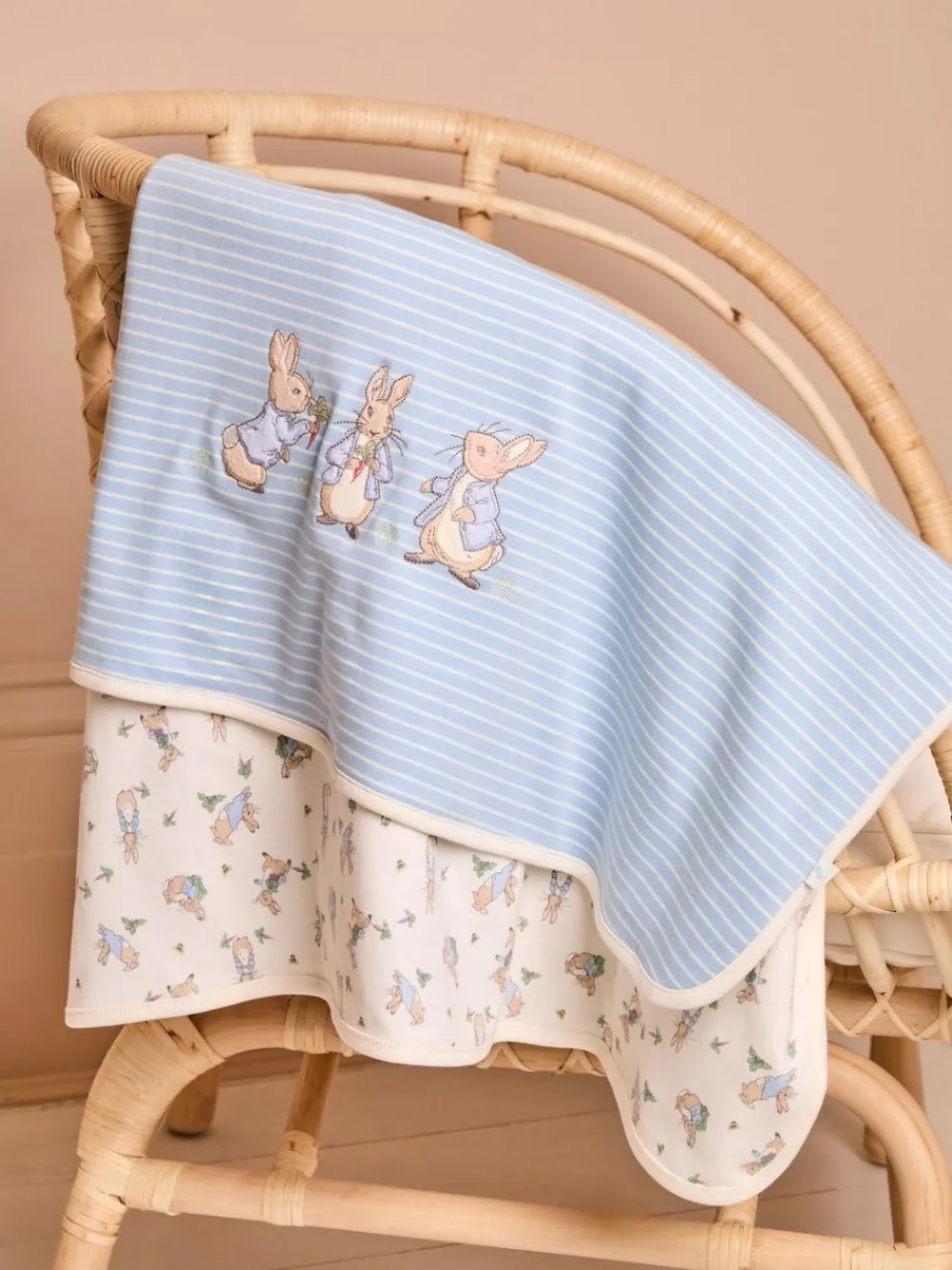 A delightful gift for a new arrival, the Peter Rabbit Reversible Jersey Shawl is soft and made from pure cotton. The cute animal motif makes it an extra special accessory, and it is gentle on delicate skin. Perfect for keeping babies warm at home or in the pram. Reversible design 90.5 x 72 cm 100% Cotton Machine washable Never allow your baby to overheat Personalise me with your chosen name