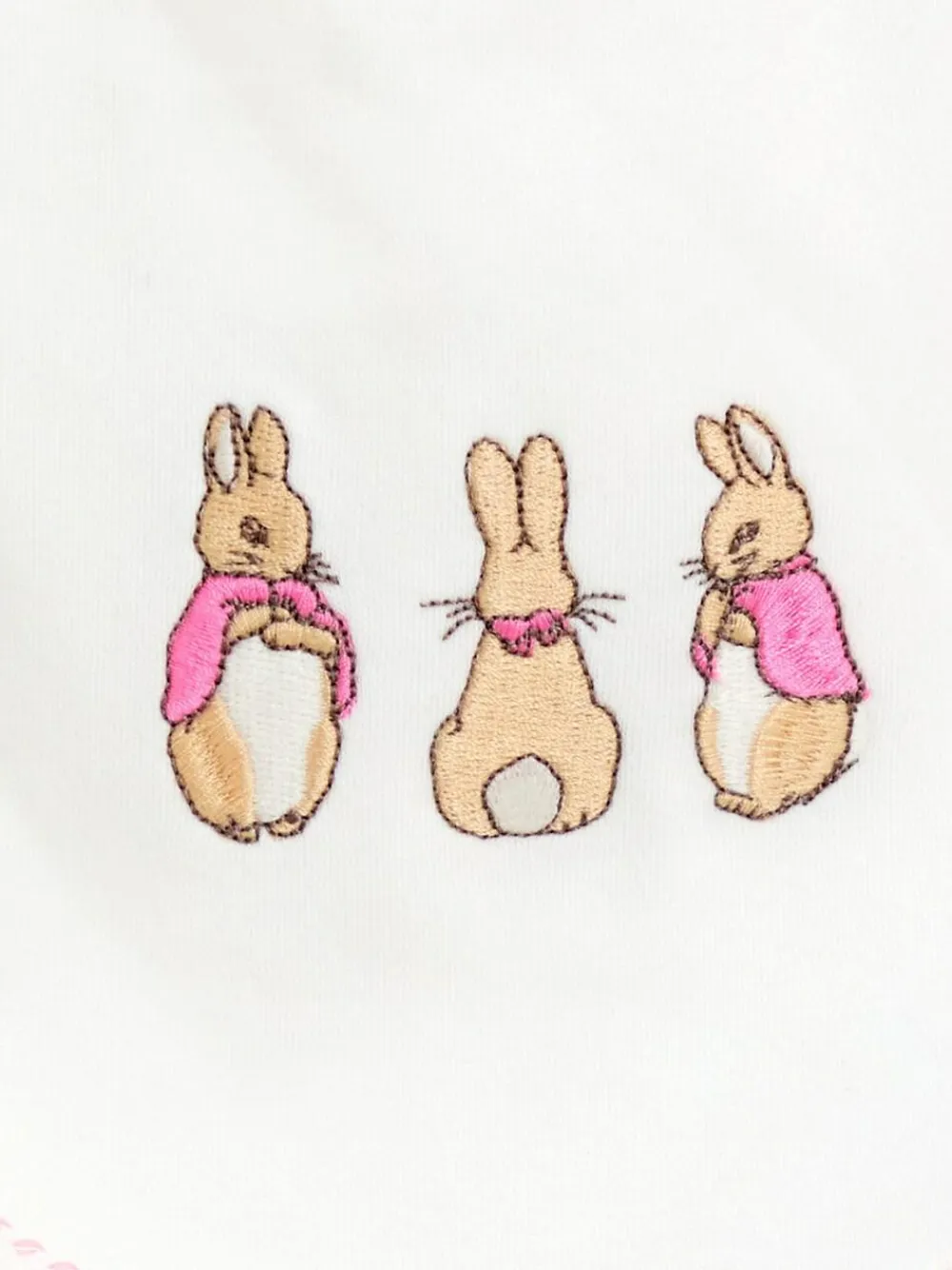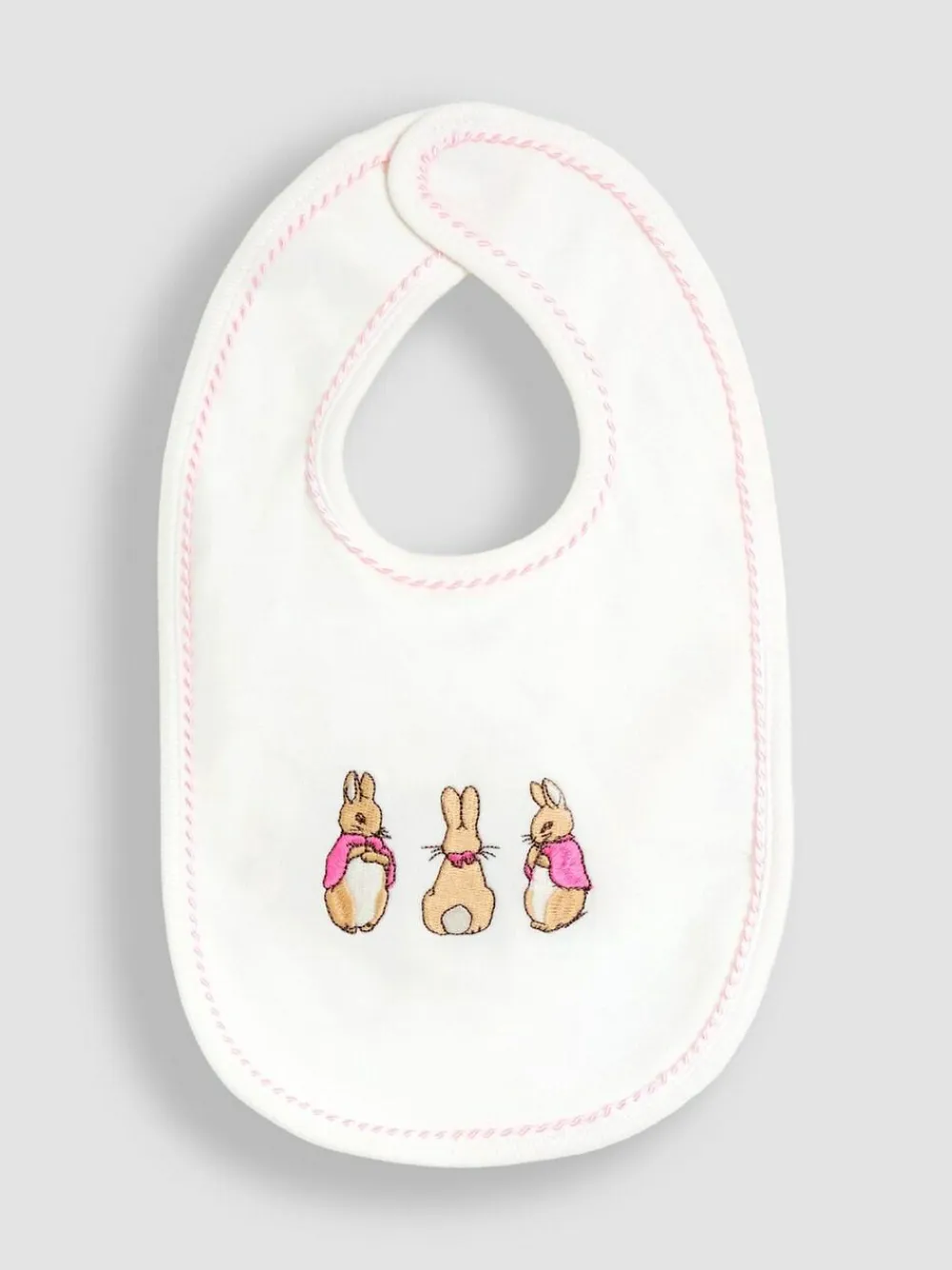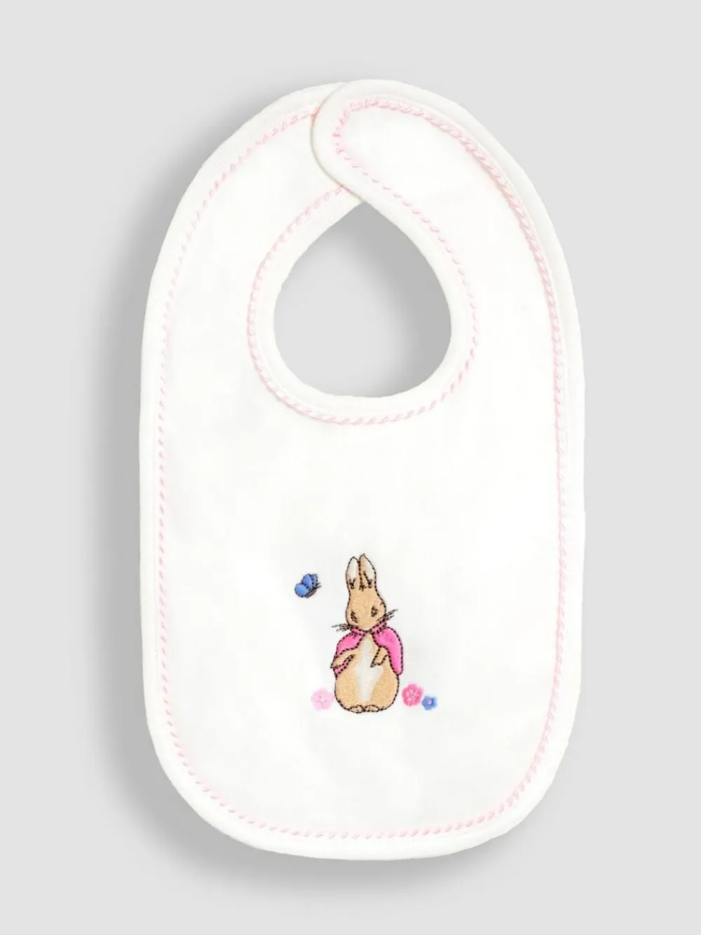 For sweet giggles and little dribbles, This handy 3-pack of Flopsy Bunny Bibs are the perfect accessory for messy dribbles and toothless giggles. With Flopsy Bunny sitting across one, all three sisters on another and one with a floral ditsy print, these cute cotton bibs have a hook and loop fastening, and gentle soft fabric, making this an ideal gift for babies. Looking for a complete set? We have matching items available too!. 3-pack set. Ideal gift. Baby-safe hook and loop fastening. Machine washable. Main 100% Cotton. Lining 80% Cotton, 20% Polyester. Upper Lining 100% Cotton.
