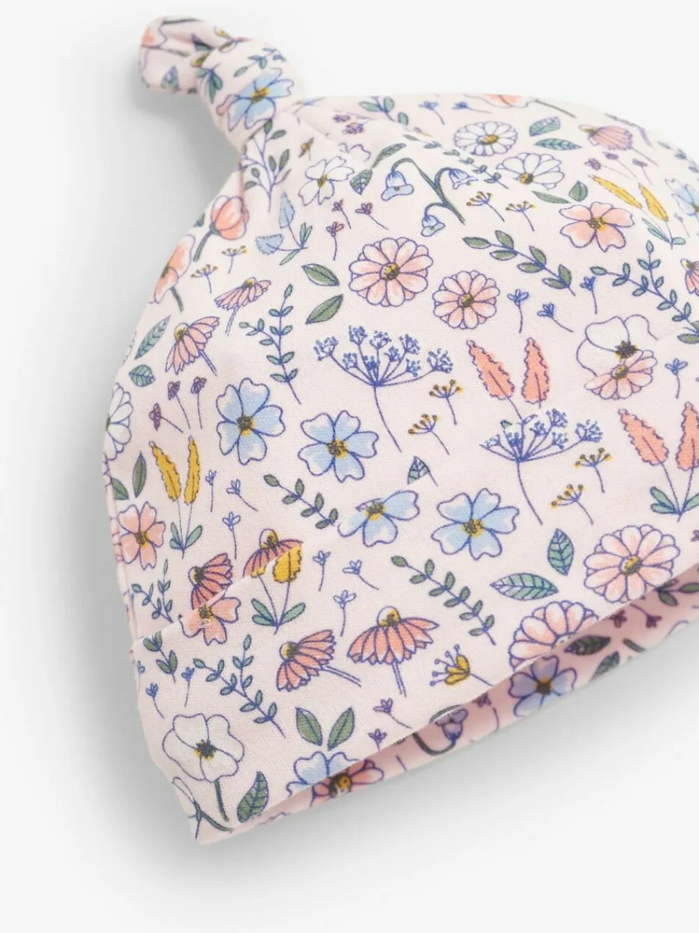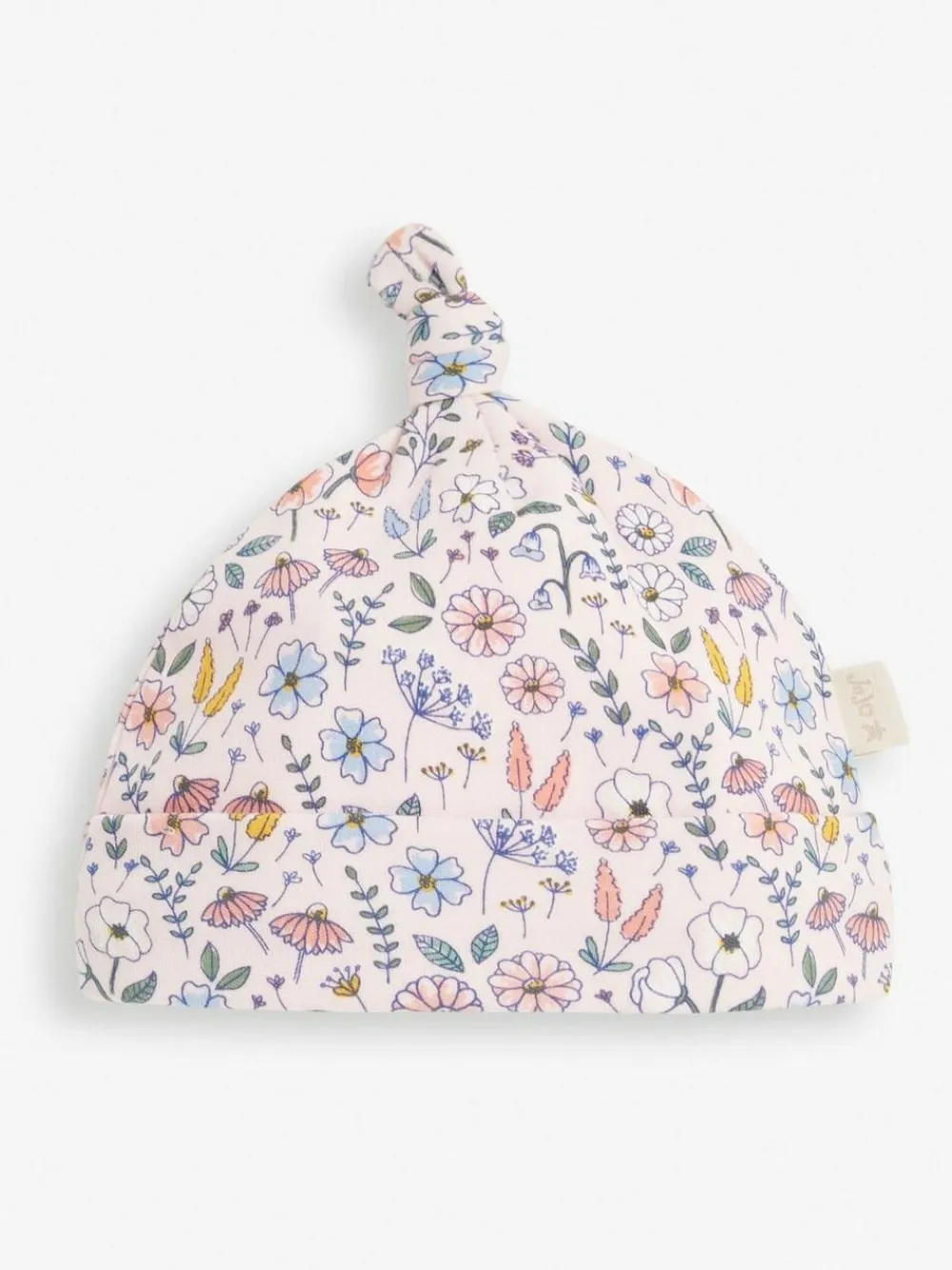 Featuring a sweet floral print on dusky pink cotton and finished with a traditional knotted top, this baby hat is an adorable way to keep new babies heads warm. All-over floral print Supersoft touch Fully lined in soft cotton Knotted top Turn back brim Coordinates with the 2-piece Floral Baby Jacket & Sleepsuit Set (C00820) 100% Cotton Machine washable Machine washable. Main 100% Cotton. Lining 100% Cotton.